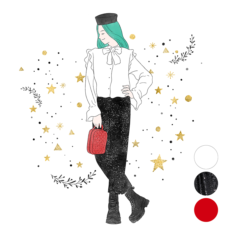 因此參加派對,也不一定要死硬派的大紅大紫才能突出自己,以女生為例,可從細節或物料著手,在平日的黑白或褲裝穿搭裡加入珠片裝飾或夜光物料,就既能在派對中爭取存在感之餘,同時亦展現出自己沉穩的個性。