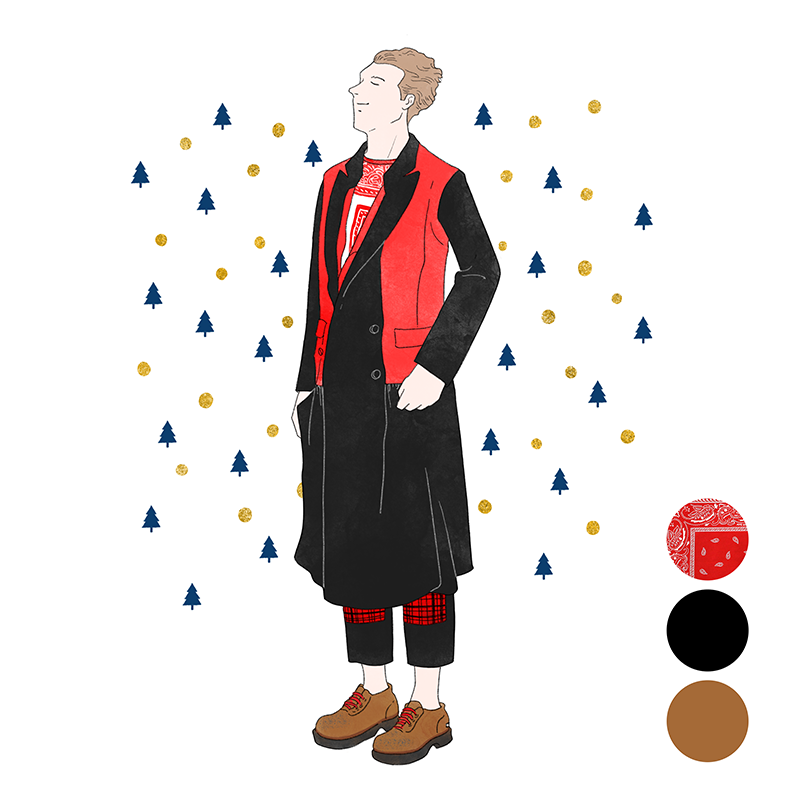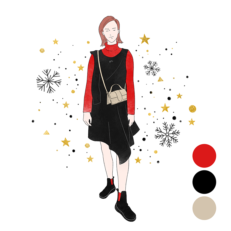 女士則可以女性化的裙裝與中性的短靴、冷調的黑色與溫暖的紅色交織出衝突感,為黑色造型帶來不一樣的花火,也能展現你冷靜與熱情之間的迷人個性。
