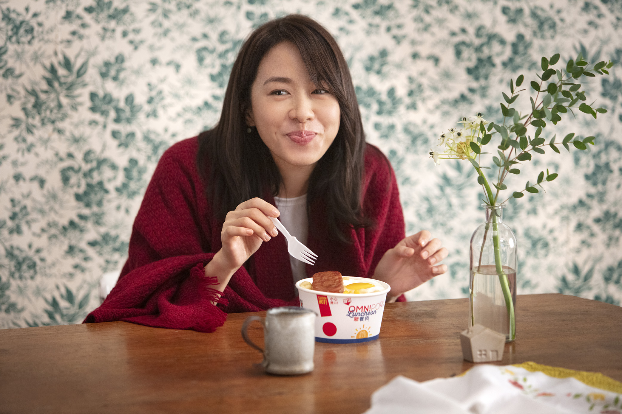 近日,女神就化身代言人,與麥當勞合作拍攝廣告,帶來一系列以新餐肉加入早晨套餐和 McCafé 美食的喜訊。廣告內的林嘉欣以活潑跳脫的形象示人,不但表達出素食的正能量,她更展示了不少親手製作的陶瓷擺設,感覺別具意義。