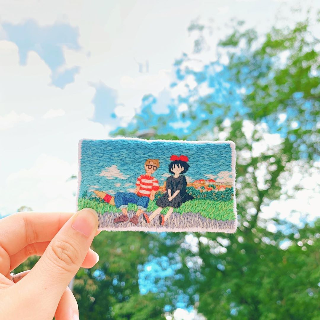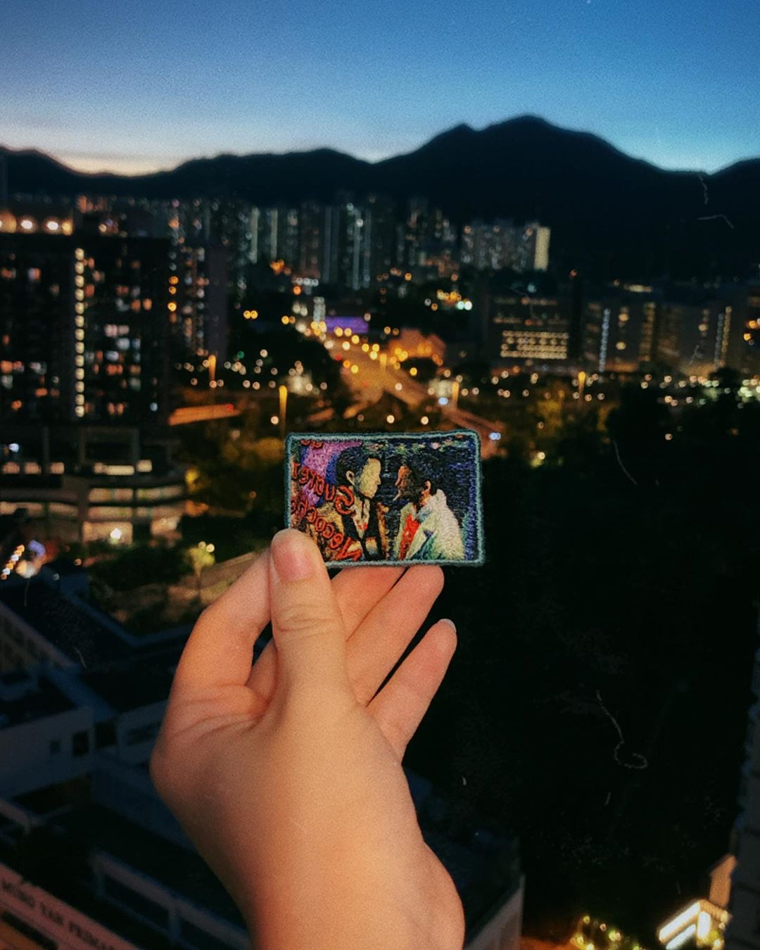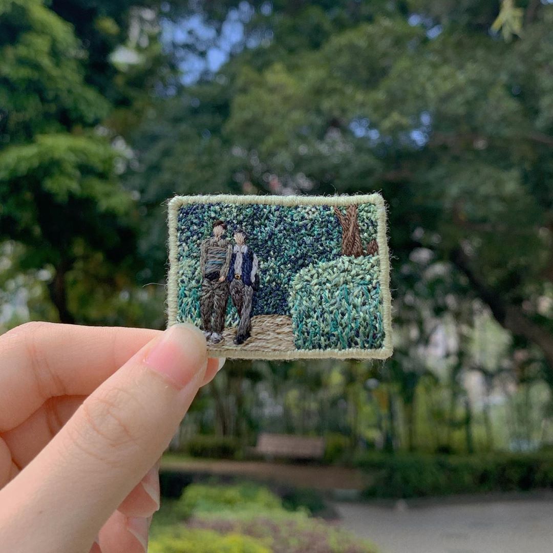 品牌名為「merry antbroidery」,在embroidery(刺繡)中加上Ant(蟻),和Ngai的發音相似,是情侶間的小甜蜜。而刺繡作品的確小巧,最小的只有3.5cm,上面繡的是《這個殺手不太冷》。刺繡的質感叫二人著迷,把線混色還是拆掉重來,每針都經過考量,並非機器的一式一樣能比擬,單是打造《叔·叔》場景的綠,已混上十種綠色繡花線。