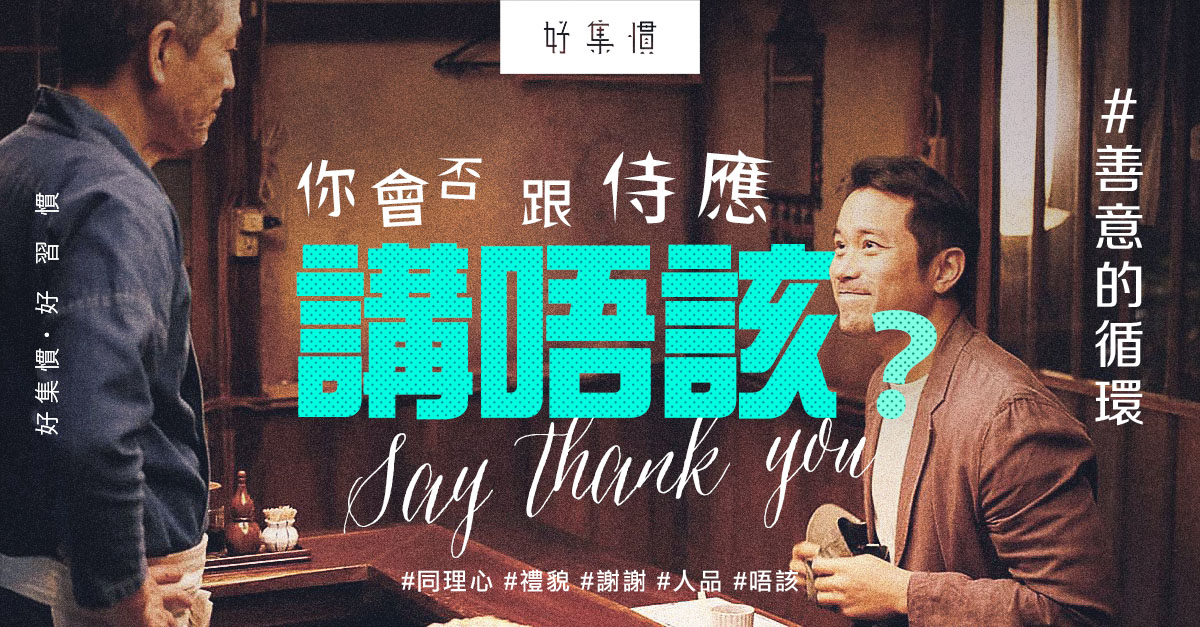 曾聽過有人擇偶的條件之一是,看看外出吃飯時,他/她對侍應好不好,有沒有對侍應講「唔該」,這是反映人品的重要細節之一。由今天起,試試跟為你提供服務的人,幫助過你的人,甚至是你幫助的人,講一聲「唔該」,這個善意的循環,最後可能以意想不到的結果回饋你。
