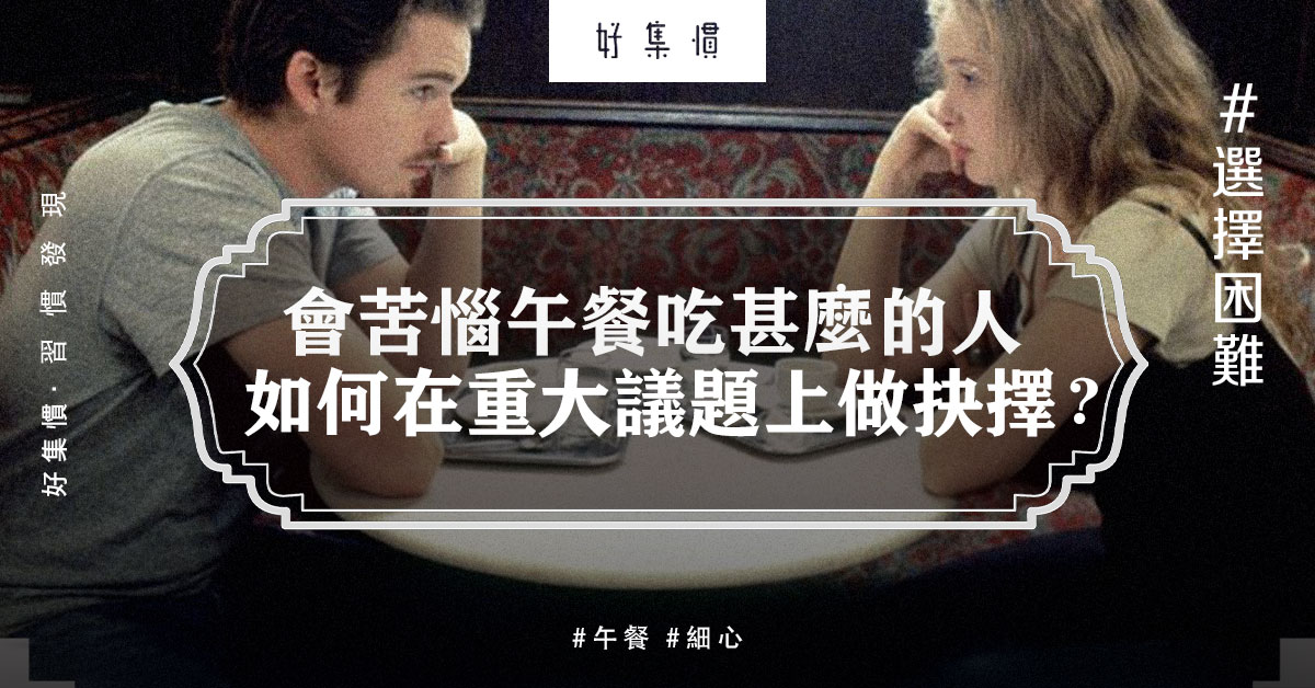 細想一下,午餐的選擇有公司附近的十多間餐廳,每間餐廳的午餐有六七款,考慮時要將當天的心情、食慾、下午的工作量、性價比、食物質素、上菜速度、座位舒適度、服務態度、跟你用膳的人、昨天吃了甚麼、當天是星期幾等等一拼考慮。正因為資訊量愈多,反而愈難作出選擇,其難度其實不比重大決策低。每天會認真考慮午餐吃甚麼的人,其實都是對自己要求高、思想縝密的人,這樣的人反而適合賦予重任,因為他不會輕易下決定,要把所有因素找出來考慮一百遍,確保這個選擇是可實行的範圍內將利益最大化。