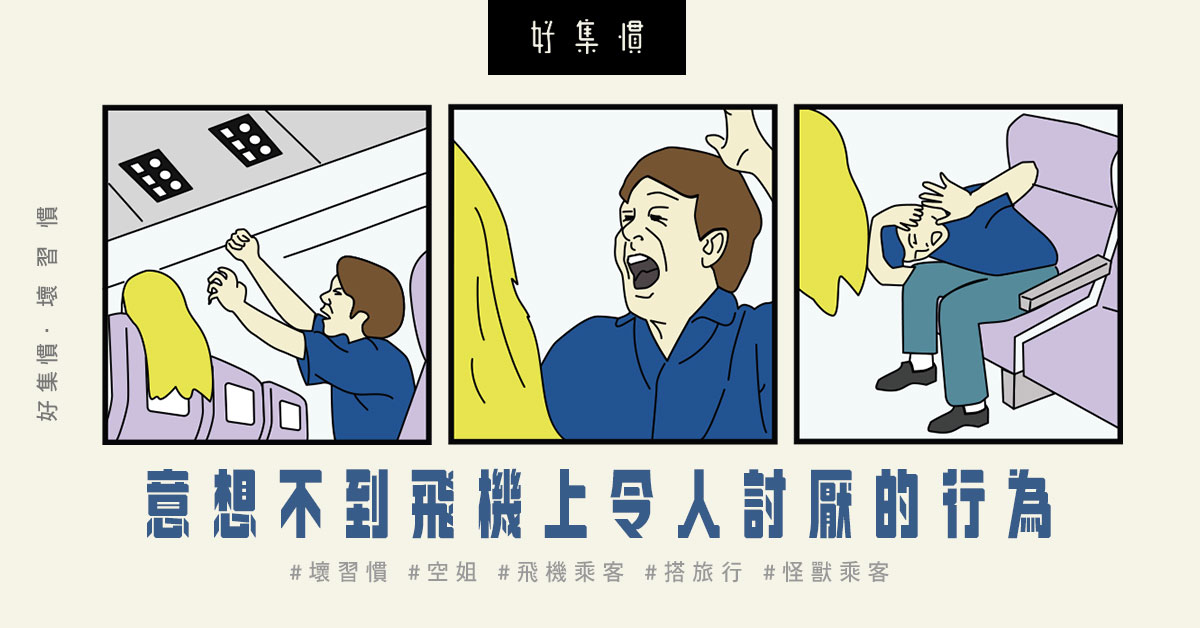 以下是機艙服務員「鄭重」指出飛機上最令人討厭的行為,你若有犯上,千祈唔好只懂得怪人,自己亦要檢討一下。最常見的「椅背挨後」、「要求調位」、「時常按鐘」唔講,講一些你意想不到的!