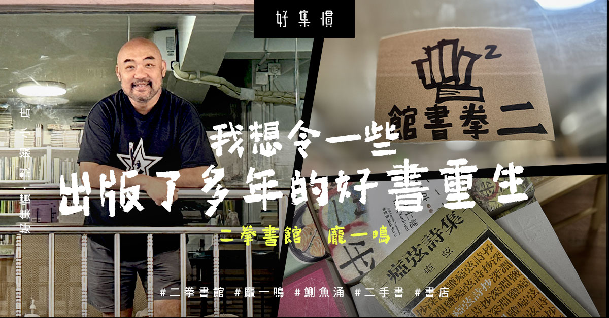 一拳又一拳,等於二拳。二拳書館是龐一鳴繼深水埗一拳書館後開設的第二間書店,主要售賣二手書。除了是循環再用、貫徹環保的理念外,其實龐一鳴有個更大的心願:「坊間大多的書店都在賣新書或暢銷書,但其實很多舊書都很有價值,只是礙於生意角度很難做,我正是想令一些出版了多年的好書『重生』。」
