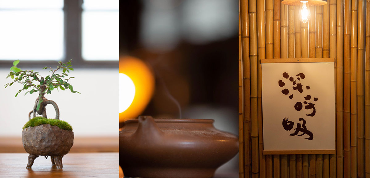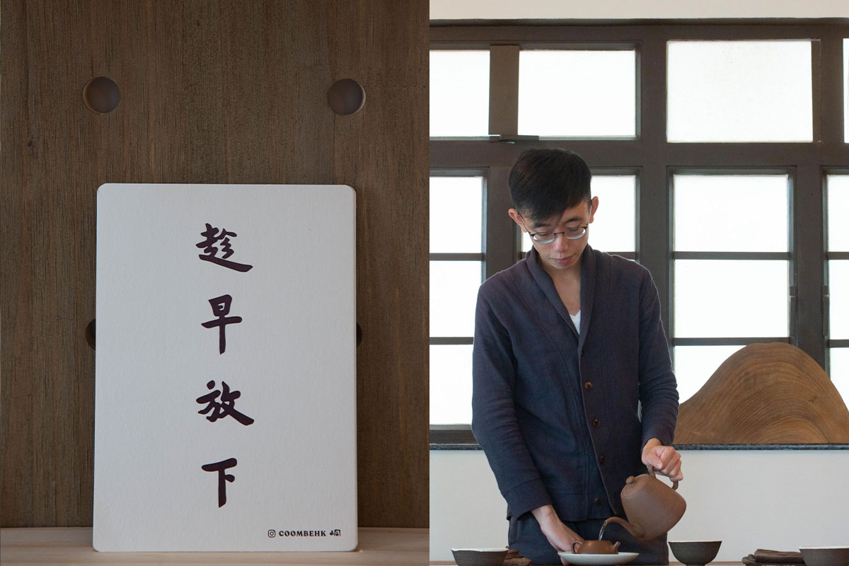 山洞亦是往內修心的獨處地方。這裡每件物品都有小故事:傢具特別用上老榆木,讓身體有更好的體驗;窗上的茶紙由造紙匠朋友製成;字畫邀請朋友創作;坐墊內部物料用蕎麥穀做成。一切一切,讓客人五感慢慢打開,仔細感受。