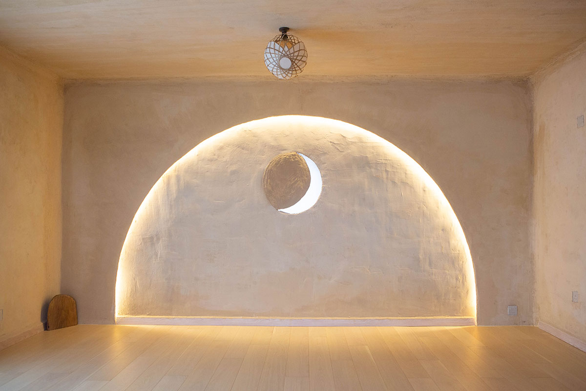 前園以石頭堆砌出一片小型種植空間,泥土混入本地堆肥,栽種著艾草和時令蔬菜,能量滿滿;往內走,屋的外牆是一幅很有質感的土牆,以本地泥土造成,多看兩眼,自會進入定靜的感覺。正式進入山洞前,已被大自然溫柔地沐浴一遍。山洞主理人 Javis 說:「空間自會給你設計的指引。」
