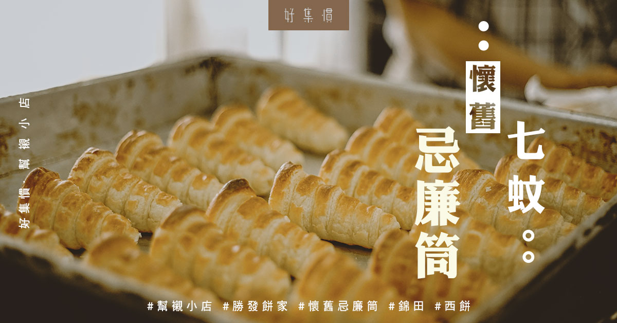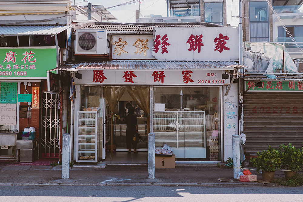 錦田總瀰漫著原始的鄉郊氣息,而大馬路轉角的「勝發餅家」,更仿佛將時光定格在六十年前 —— 餅櫃放的,是在市面已經難以找到的懷舊的港式西餅和麵包;門口最上方的兩副舊招牌,老闆蔡師傅訂來新的,在下方重新裝上。三塊招牌相互交疊,見證著外頭的蘆葦綠了又黃,黃了又綠;而「勝發餅家」四個大字,始終閃亮。