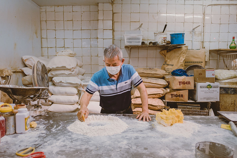 今年七十歲的蔡師傅腼腆寡言,但十分愛笑,笑時,眼角露出深深的魚尾紋。與不少上一代一樣,他 60 年代初與家人由內地來港,而第一份工作,便在勝發餅家學師。那段日子並不容易,「以前啲師傅唔係咁輕易教人;做下欄做咗 2 年,先開始學做麵包、唐餅。」