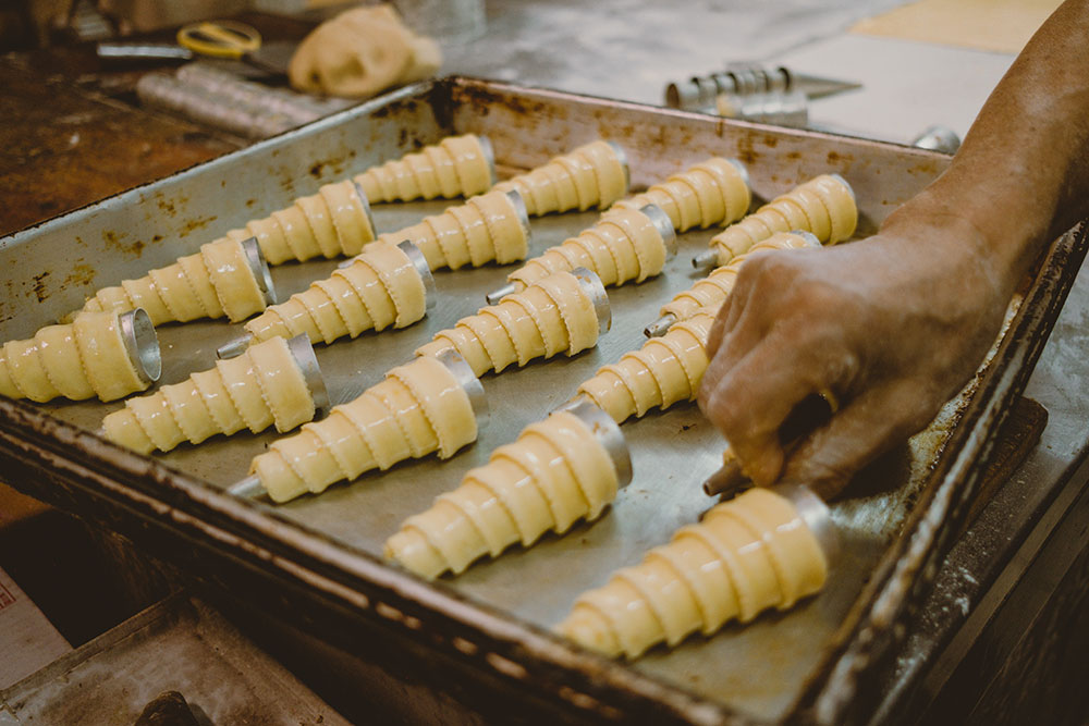 忌廉筒工序多,背後全是功夫:搓皮、 摺皮、鎅成條狀、掃蛋漿、以模具捲成忌廉筒形狀;再來是烤焗、脱模、擠忌廉,沒有技巧與心思,絕對做不出來。
