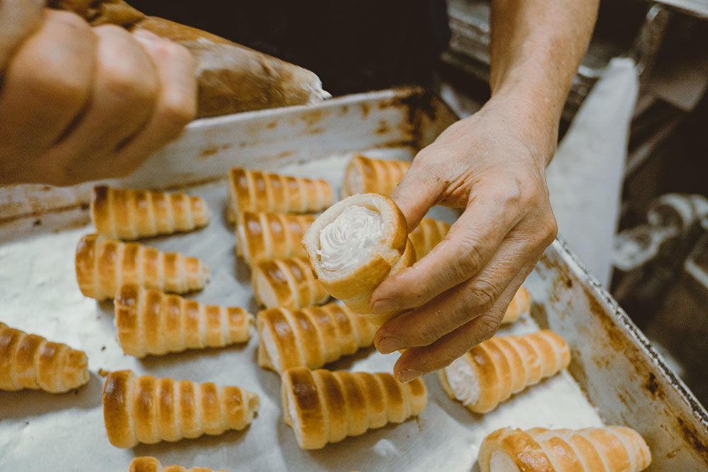 談及鋪頭名物忌廉筒,師傅臉上總是帶幾分自豪,「呢行會整嘅鋪頭,唔多過十間。」也難怪,小小一個,索價 7 元,背後卻全是功夫,「單講捲忌廉筒,就算熟手,都要五分鐘一盤。」師傅坦言搓菠蘿包的話,同樣時間起碼能完成三倍成品。雖說忌廉筒是懷舊小食,但它的捧場客廣泛,甚至有客人特意從離島、九龍坐車到錦田,高峰時期,每天能賣出過千個。