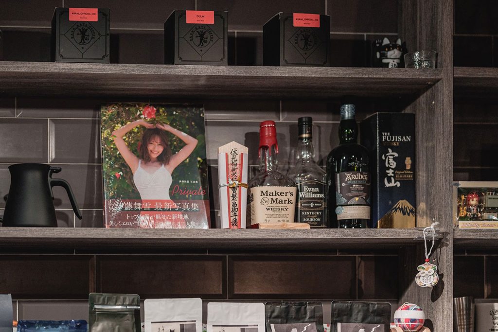 咖啡架上除了不同產地的咖啡豆外,亦有店主最愛的伊藤舞雪寫真集。