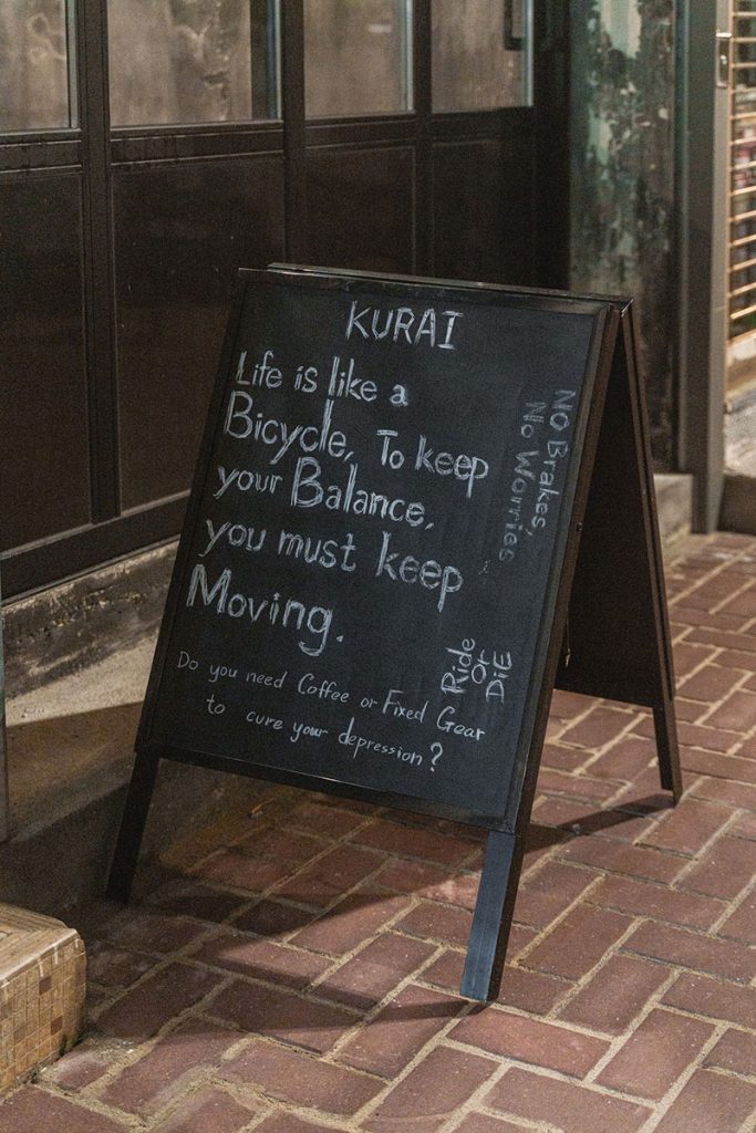 「Kurai」位於一條寂靜、隱蔽的小巷,店內灰黑色的設計配上 T 字型格局,感覺很神秘。拉門而入,先會見到掛在牆上的 Fixed Gear 單車,直望便會看到正在沖煮咖啡的店主,以及身後不同產地的咖啡豆和伊藤舞雪寫真集,店舖的角落擺放了結他等樂器,更設另一個出入口方便騎單車的客人 —— 這些擺設都是店主所愛,希望客人即使身處暗黑的地方,亦能發掘到喜歡的事情而發光,「我想令客人愛上我喜歡的東西,我們可以一齊享受。」例如,最近就有客人在店主的耳濡目染下,嘗試踩單車,更買了一部他未懂操作的 Fixed Gear 單車。