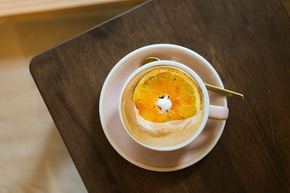 由「休cafe」咖啡師在開店初期研發的招牌特飲Orange Caffe Latte。