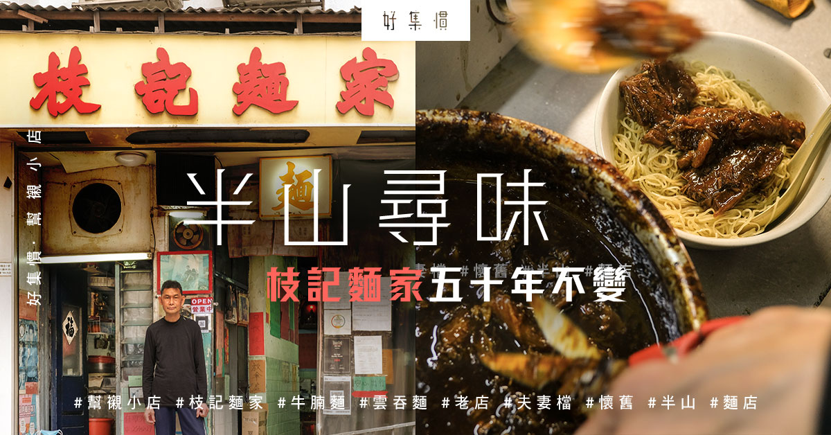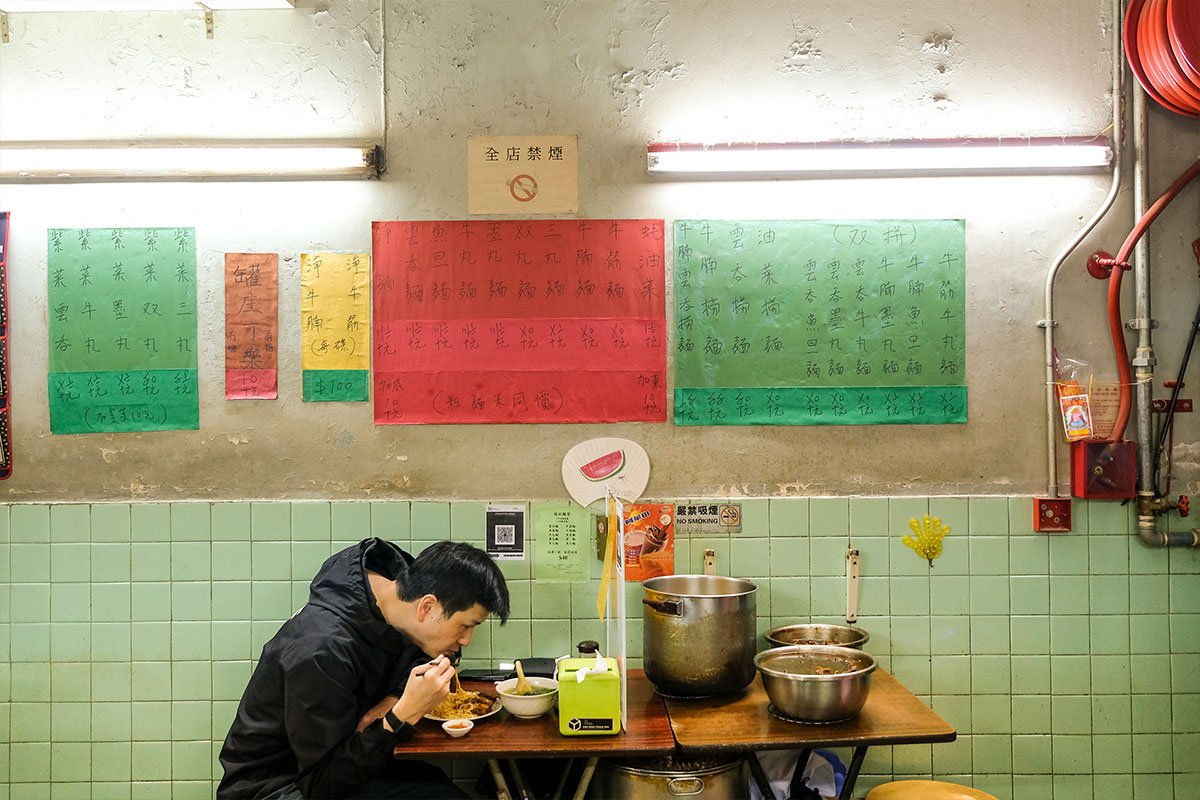港島西半山上有豪宅,下有學校民居,街道繁忙。在貴族與平民交會的三岔口,卻有一家古舊麵檔,內藏青綠牆磚、紙皮石地、摺枱摺凳、大牛龜電視,將時光凝在半世紀前,牆上餐牌還有老闆娘龔笑英手寫的花碼。午後清閒,七十歲的老闆盧炯明出來搭話:「嗱舊式嘢買少見少,唔影就走寶喇!」