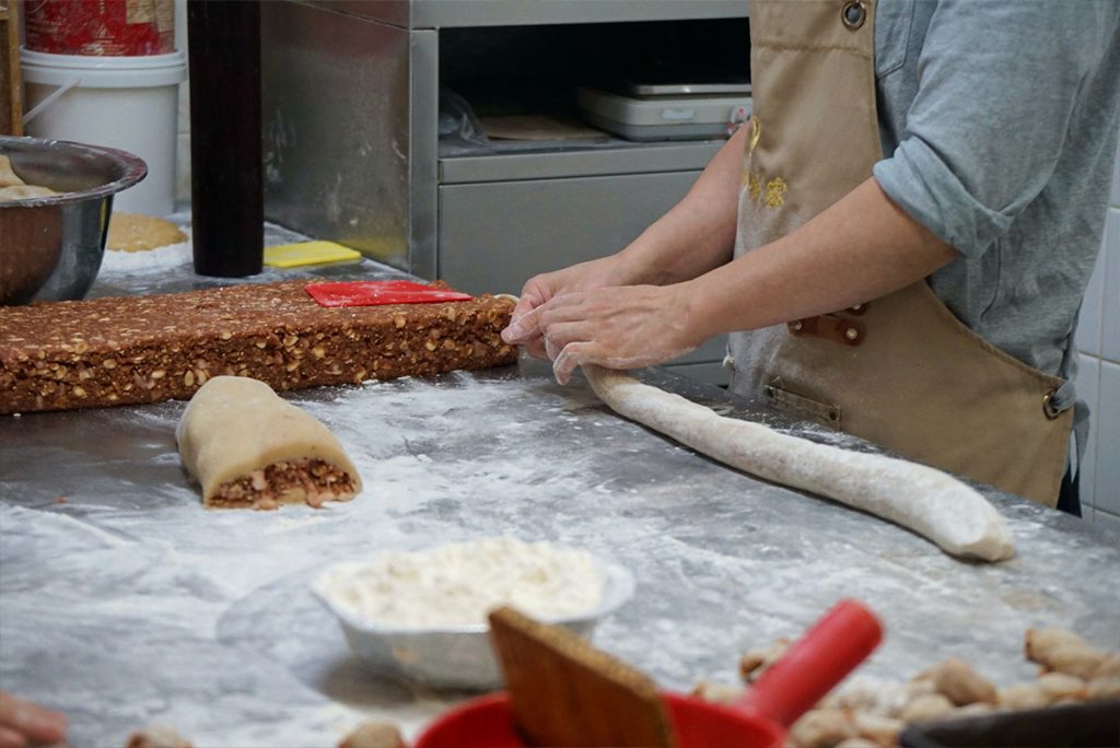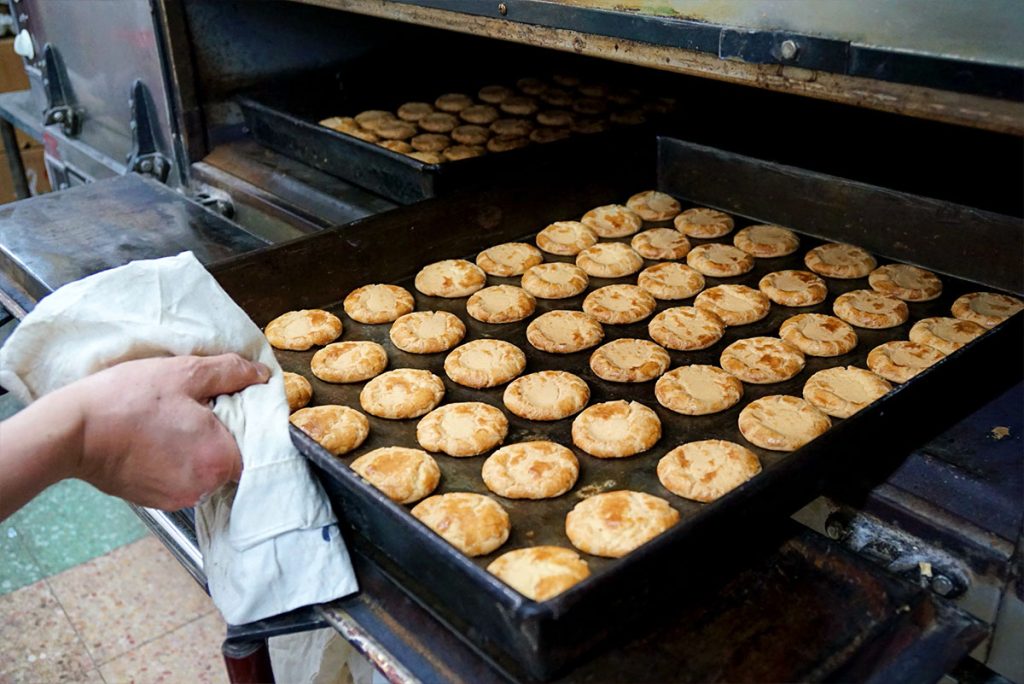 八仙的得意之作合桃酥,不作禮餅也有很多老顧客幫襯。掌管出品的李師傅,每天在後方的工場即製即焗,滿室烘焙香氣。已在八仙工作廿多年的他經驗老到,搓麵粉、塗蛋漿動作利落,還要時時刻刻留意爐火,嚴謹把關,務求出品完美一致。