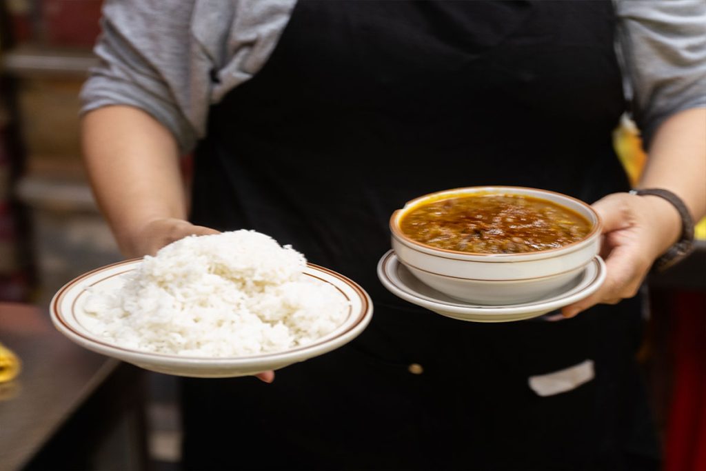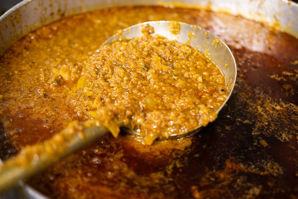 又為什麼開設在廟街?原來,在上世紀五十年代,不少巴基斯坦警察駐守油麻地或從佐敦上岸,都說味道最能解鄉愁,他們一上岸便來吃咖喱,於是上一代廚師在了解過他們的口味便研發了「差房咖喱」,就是現有阿龍咖喱的味道。這裏的咖喱分為大、中、小辣,不吃辣的唯有吃番茄味道。「有人提議分什麼10小辣、小小辣;但那就不是巴基斯坦咖喱的辣而不嗆的獨特風味,我寧願做個番茄汁也不願妥協。」Pat姐直接地說。