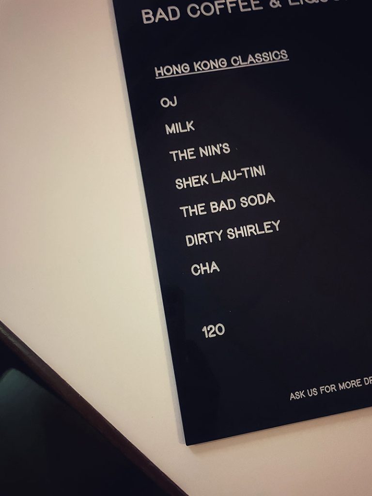 「空間」是有趣的。雖然是位於車水馬龍的油麻地彌敦道,卻隱藏在舊樓的商場裏,店外一個褪掉的X記鮮菓士多招牌換上啞膠力水牌,寫着:Bad Coffee and Liquor,壞咖啡與酒,Bad service all day是小店的自我介紹。之所以稱之為「空間」,只因小店11am-5pm賣咖啡,7pm-late賣酒。全日賣「壞服務」。