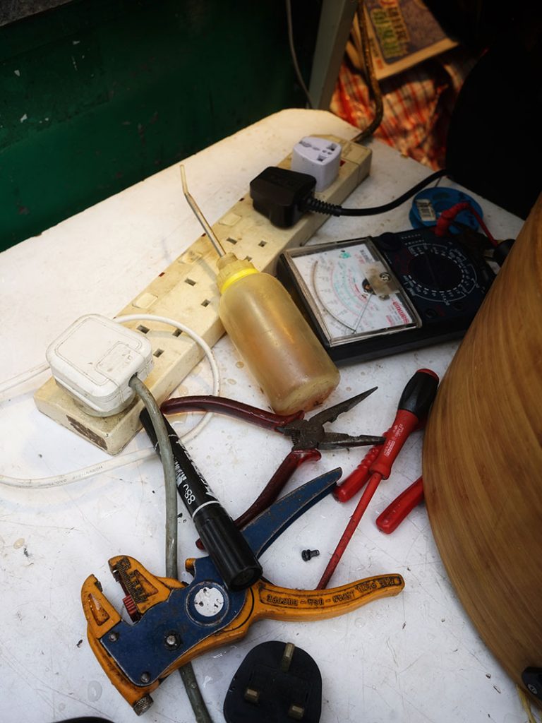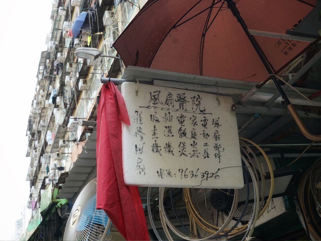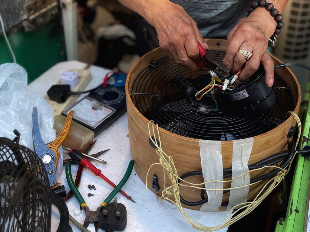 「以前風扇好襟用,八、九十年代的金碧扇、三荾牌風扇,用料好,風力又夠,肯定比現在代工的風扇襟用得多。」現在,新式的鴻運扇或無扇頁風扇更多是電腦組件,修理起來麻煩得多。「我都識整,不過麻煩啲,可能修理都要幾百蚊;有時修理唔到我咪唔收錢囉。」所以,現在來修理風扇的大多是老人家上一代人, 因為惜物?「又唔係咁講,冷氣電費貴得多,況且老人家吹得多冷氣不太好,還是愛吹風扇。」果然,馬上有個婆婆來修理風扇。「有時又唔係淨係錢嘅問題,明明風扇只要修理過後還是可以用,因為嫌麻煩就掉到堆填區,真的很浪費。」
