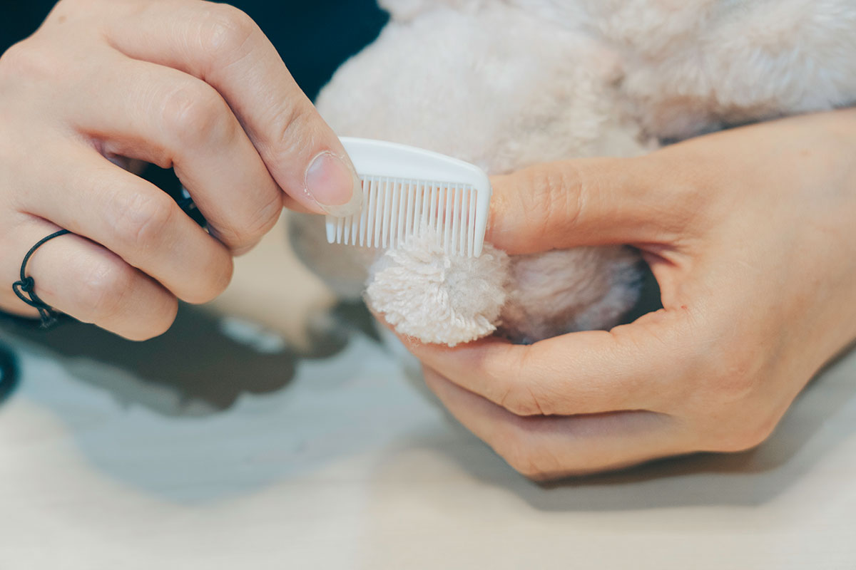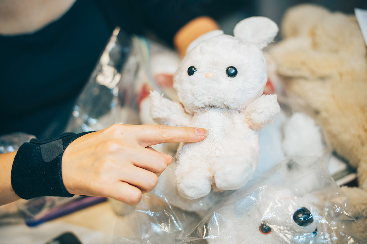 在觀塘工廈一角,小小的工作室內五臟俱全。角落一部衣車,刷子剪刀鉗子、各樣工具和配件整齊安放,待修的毛公仔則乖乖的在櫃裡靜候。寶姐說常見的處理包括深層清潔消毒、換棉花、更換五官,甚至重建「皮膚」等。而這天她則要為一隻小兔進行植毛:一條毛冷搓開成一絲絲、再逐條用鈎固定在掉毛位置、然後是修剪長度及梳理;工序精細得宛如外科手術。