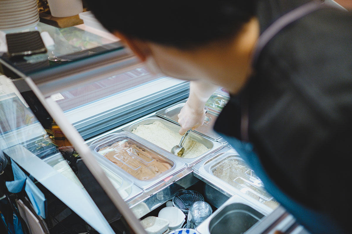 走進店內,便見店主 AK 與太太阿魚埋首於廚房。AK 曾在咖啡店工作,再到意大利學廚。兩年前因疫情關係提早返港,恰巧見到商場招租。早在意大利時已常負責製作雪糕,而心儀舖位又指明要用來賣甜品,彷如天意,便與太太一同開舖。