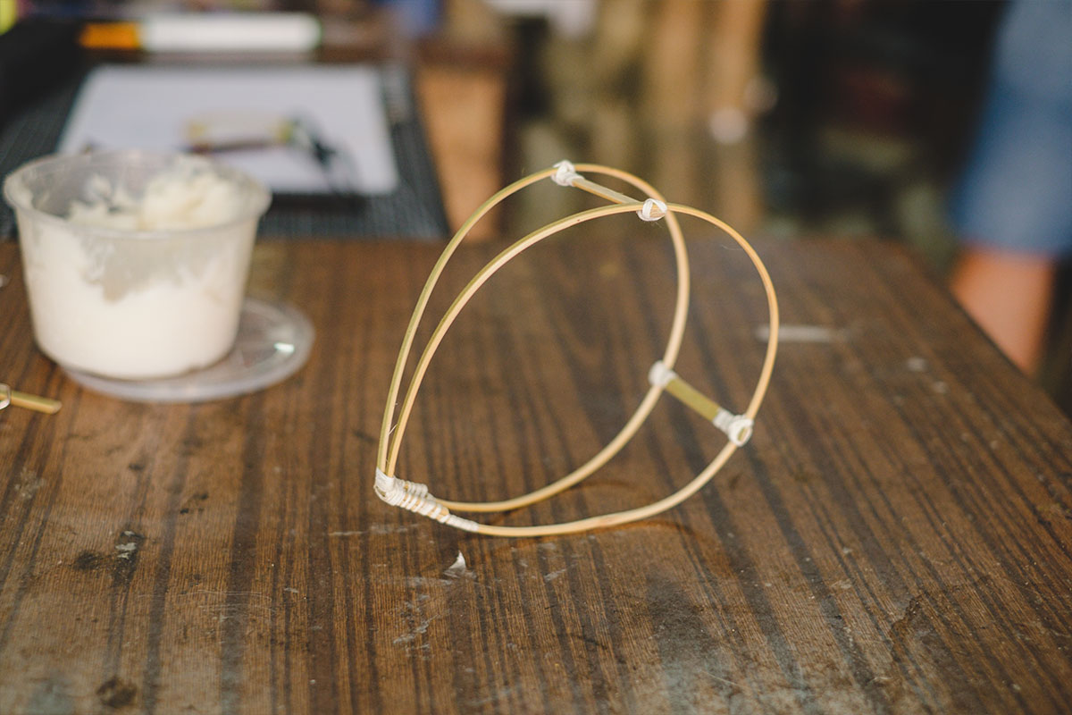 父親可曾送花燈?「倫理劇就有!要咪自己整囉。」身為兒子,梁金華中學起幫手紮作。當年老師傅來自廣州佛山,或專門紮獅頭,或精於造花燈、弄梯料,小子集各家之大成,觀察下問下,竅門就開,總飛句「明啦」、「好鬼易喎」。語氣抵死,實情也串得起:「我絕對有天份,獅頭中四暑假已自學紮過。」聽來簡單,其實動輒幾小時,先構思形態,削滑竹篾,紗紙捋幼變韌,綁竹篾紮骨架,沿骨幹貼紗紙,麵粉加水和白礬,慢火攪至半透明起泡,即成漿糊,最後添上彩繪或剪貼。