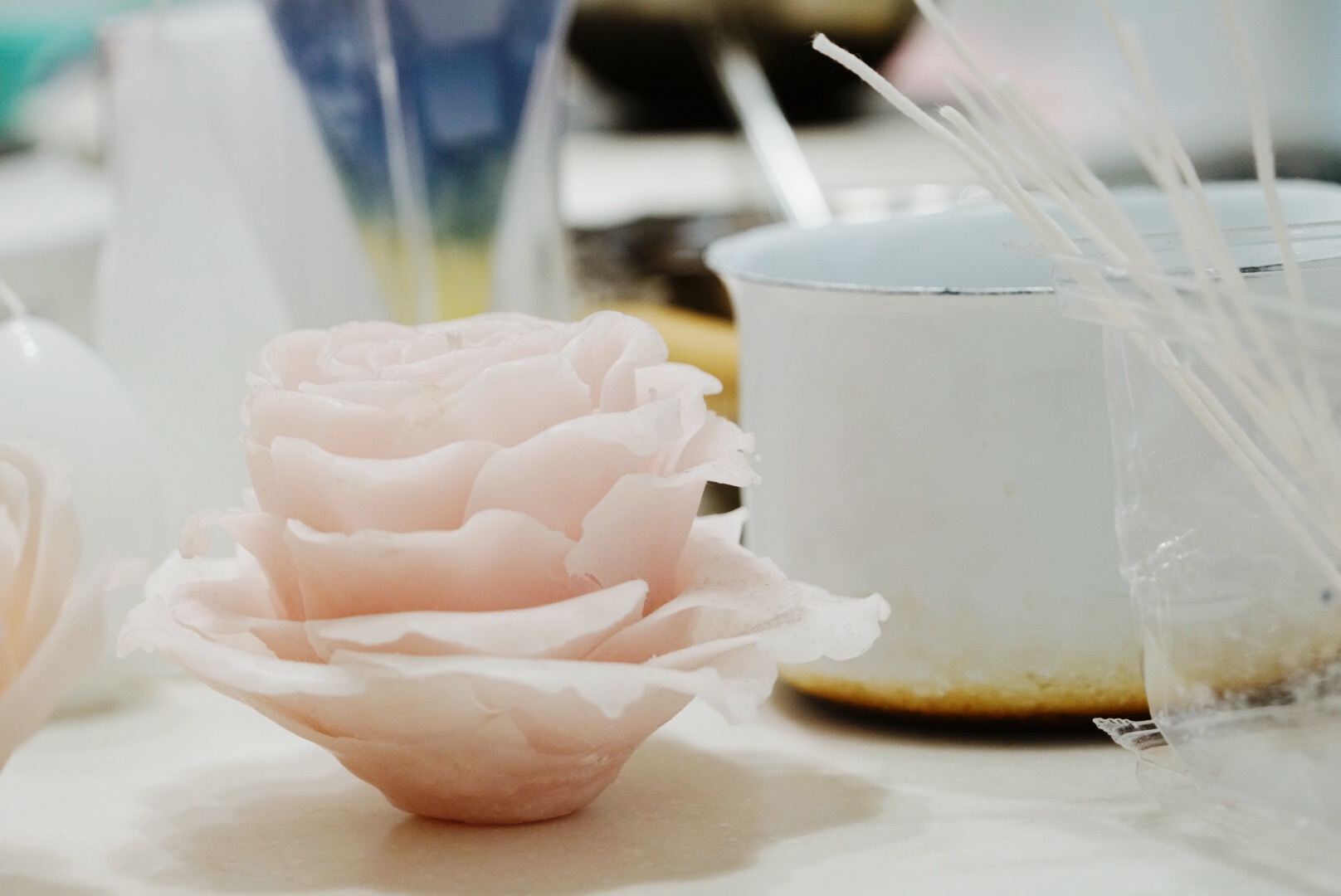 相較香薰氣味,蠟燭吸引她的是溫度,以及手捏的過程。全情投入每個步驟,所有煩惱頓時消失。「我無嘢可以倚賴,只有蠟材陪住我。」她每日反覆嘗試,更跑到圖書館借書研究,由蠟材、溫度、手法等一一重頭學起。