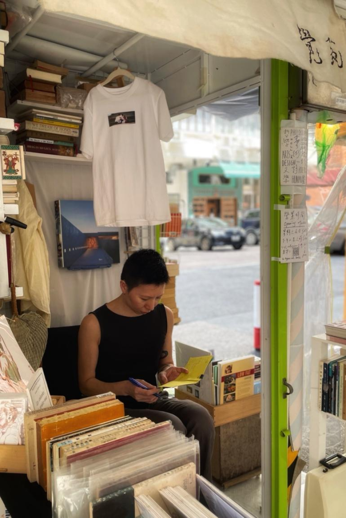 在覺苑小小十多呎的排檔空間,放滿自己熱愛的書藉,後來也有不少人送書,也有不少朋友放上文創寄賣,都是藝術。「其實,你也不必一定要買書,來翻翻看,或是吹水聊天都可以,當識多個朋友。」尤其,志同道合。檔口的一部復古壓字機,「是某個朋友送的,你也可自己壓字,不收費的。