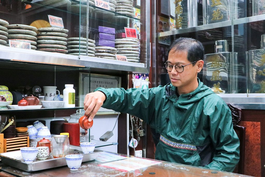 走進鋪滿紙皮石地磚的店舖,放眼皆是寫上毛筆字的鐵茶罐,以及整齊堆疊的茶餅。店舖更保存了過百年的紅印普洱茶餅,當年以港幣幾十元購入,現已升值至七、八十萬一餅。問到新舊茶的分別,兒子Bill解釋道:「舊茶會多一份陳味,而且沒有那麼『削胃』,對促進血管運行很有幫助。」
