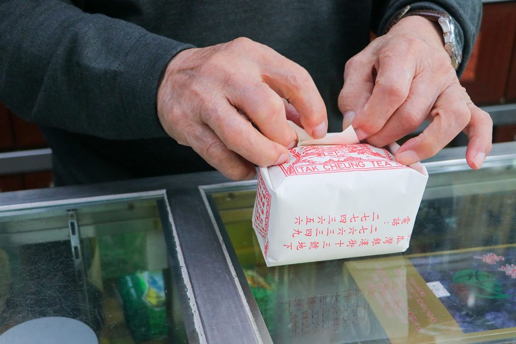 張伯巧手把印上店舖標記的包裝紙摺成長方體盛載茶葉。