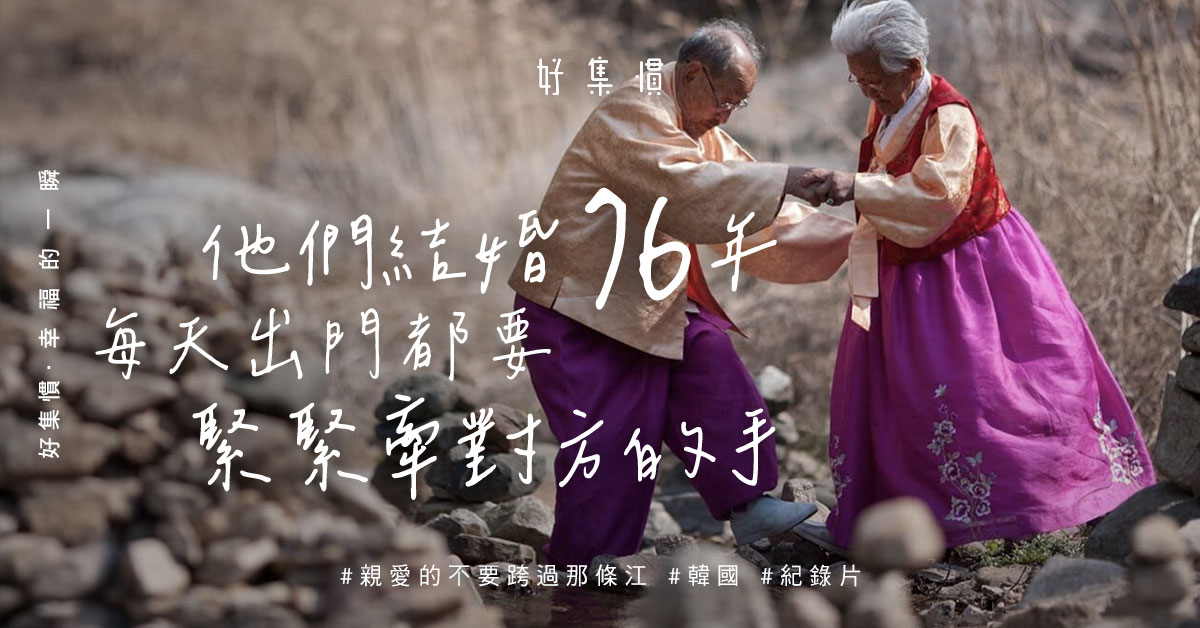 這是來自韓國紀錄片《親愛的,不要跨過那條江》的畫面與動人情節。導演花上一年多的時間,紀錄了老爺爺曹炳萬和老婆婆姜溪烈的生活日常——「不要跨過那條江」源自韓國一首民謠,內容唱着一位丈夫為保護妻子,不讓她過河,而自己過,結果卻不慎墮入河中。紀錄片中的夫婦真實成婚 76 年,一直相親相愛,陪伴與守候,就是最漫長的幸福,多得對方成就了自己美滿一生。這段最後的時光被拍成紀錄片,讓人們重新懂得,細水長流的愛情總是比轟轟烈烈的動容來得更悠長。上映時感動萬千人,開創了韓國獨立電影首個 400 萬觀影人次紀錄。
