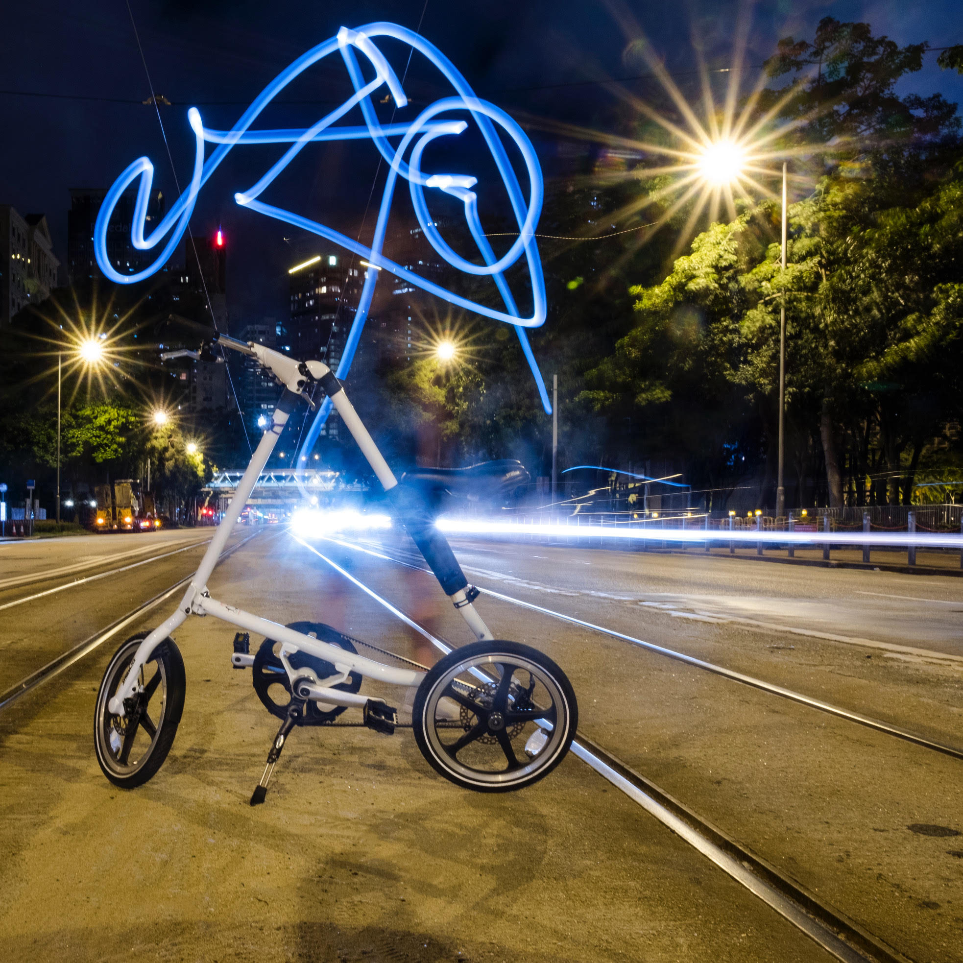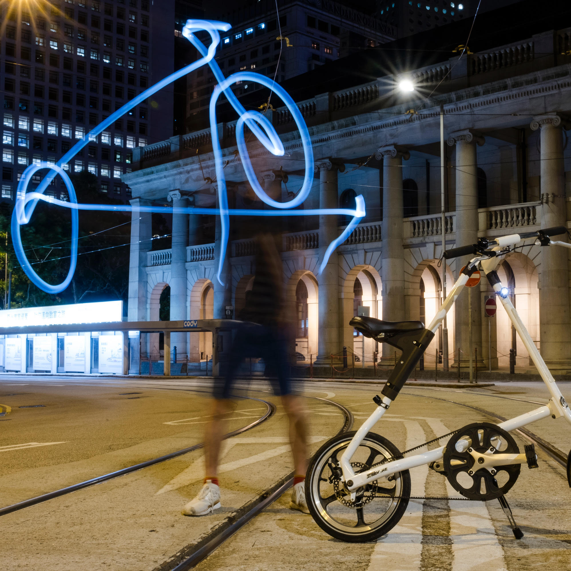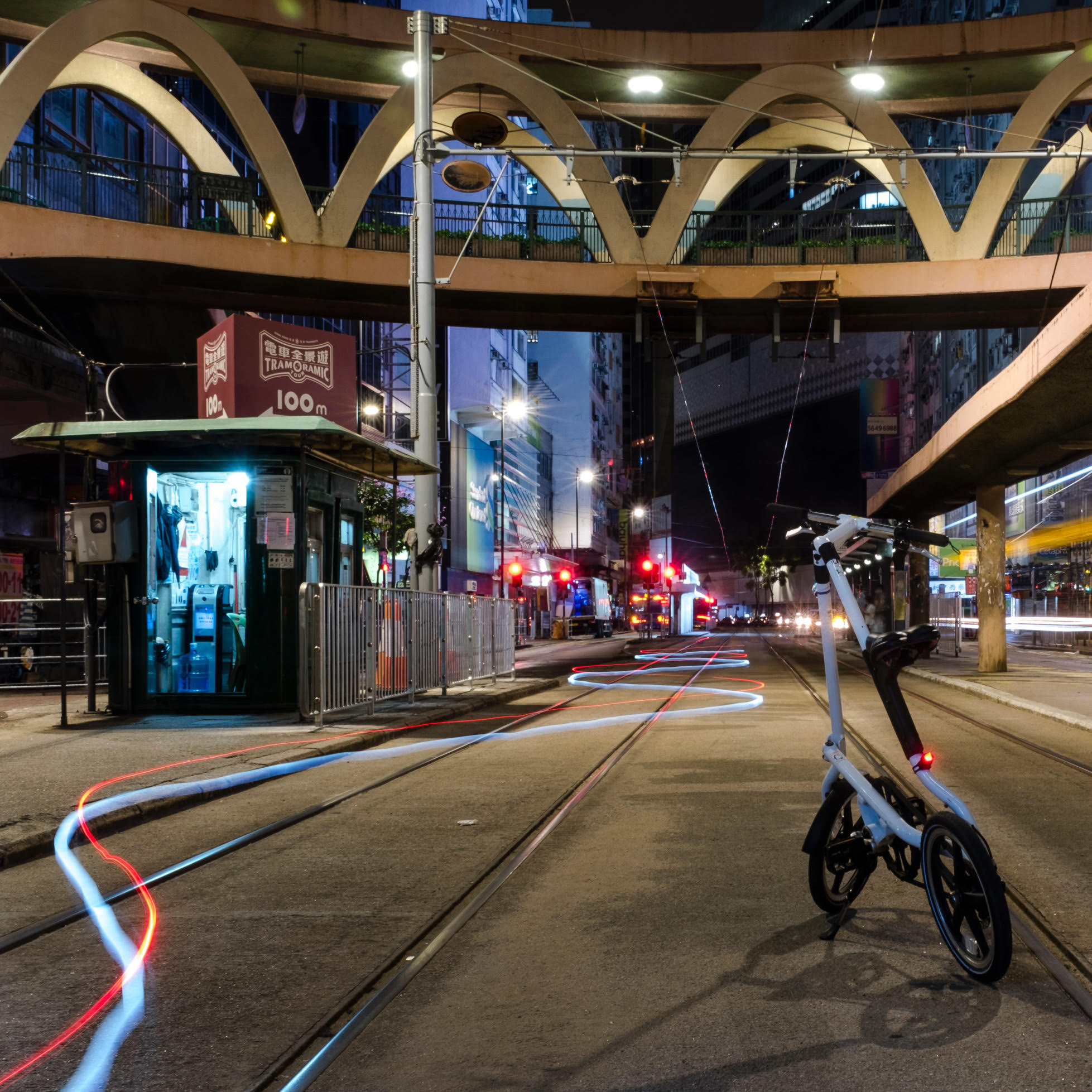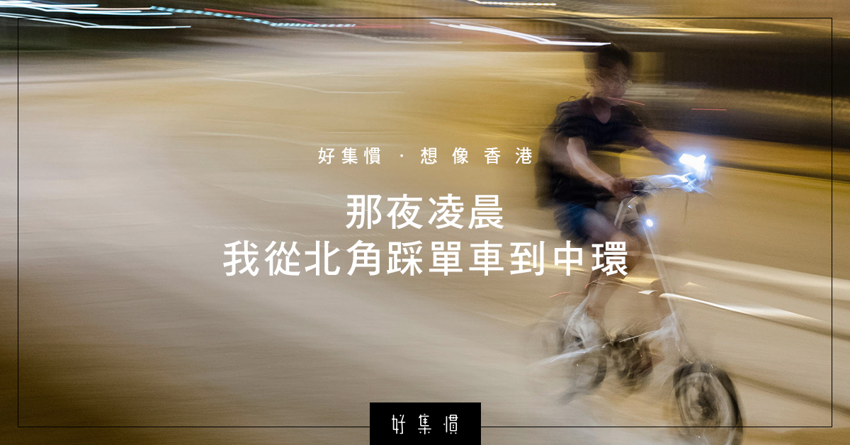 凌晨12:34,北角春秧街見。之所以是12:34,只因最後一班由筲箕灣至堅尼地城的電車由12:09am開出,之後電車路上再沒有電車,我們打算由北角踩單車到中環。得先發一下牢騷,香港島從來不是一個bicycle friendly的地區,當全世界大多最先進的城市都推祟發展單車城市時,香港港還是沒有單車徑,你也不能在行人路上踩單車(那是犯法的),況且香港人多車多,在馬路上踩單車的而且確很危險;但明明香港島由北角至西環,地勢平坦,其實是很適合踏單車的,也可減少汽車排放污染;況且,晚上踩單車,自有一份浪漫⋯⋯算了吧,不發牢騷了。