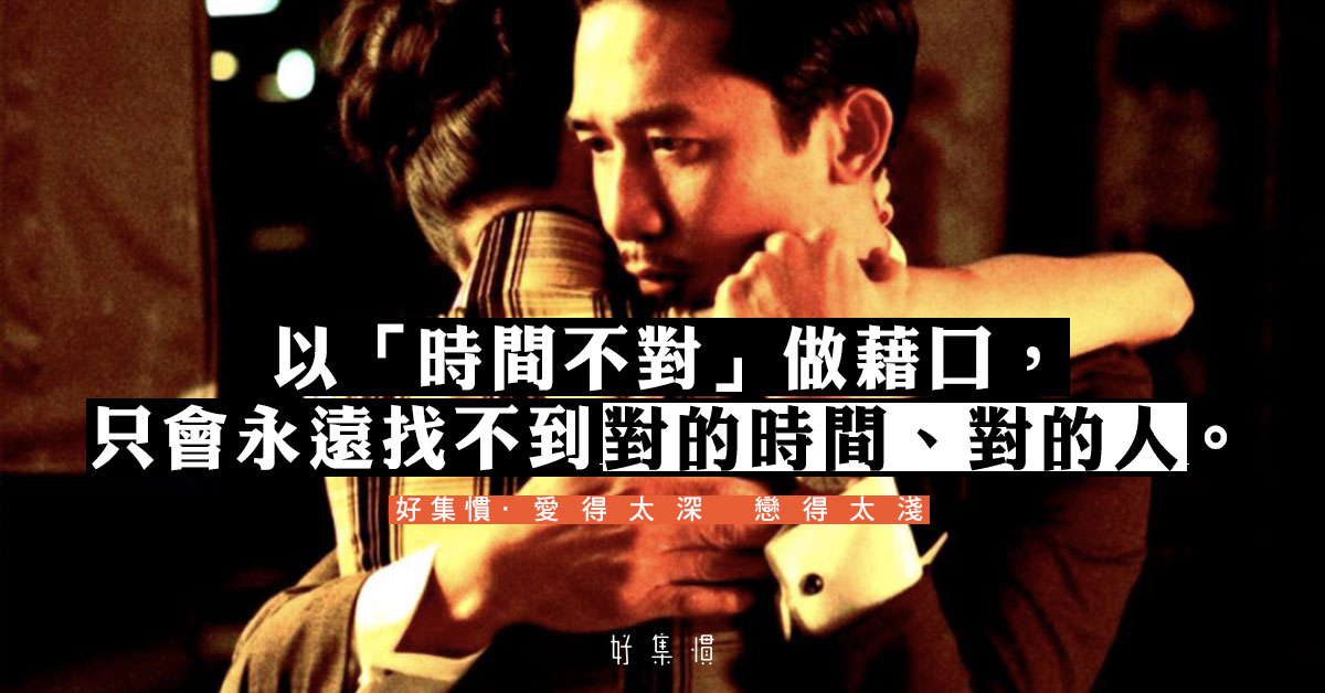 在電影《2046》中,周慕雲跟蘇麗珍說:「其實愛情是有時間性的,認識得太早或太晚都是不行的,如果我在另一個時間或空間認識她,這個結局也許會不一樣。」的確,不少人在分手時,都會覺得: 「你很好,可惜我們相遇的時間不對。」