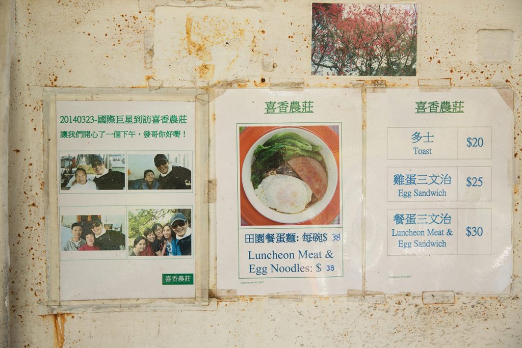 喜香農莊提供餐蛋公仔麵、三文治、啤酒和汽水,也有豆漿咖啡奶茶。「我們的咖啡奶茶用山水沖泡的,零舍不同。」傅生又笑呵呵地說。奶茶索價二十五元,驟眼看可能覺得很貴,但當你知道士多的所有食材全是要租賃小車從青龍頭運過來,得費一番工夫,而山中士多平日行人不多,其實也賺不了多少,「經營農莊不過是過過日辰,予人方便。」
