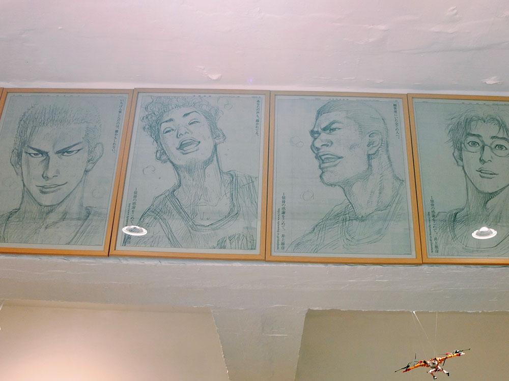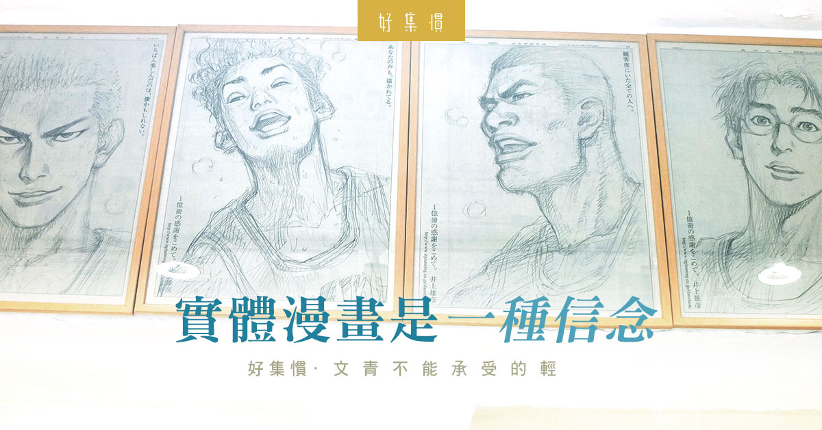 且慢,除了看漫畫書,一旁還有利志達創作的真跡手稿,或門小雷的漫畫海報;不過別錯過抬頭看一看:那是在2014年日本《SLAM DUNK》紀念發行一億冊的日本刊登的全頁廣告剪報,一套六款,花了Karman花了幾年時間搜集。