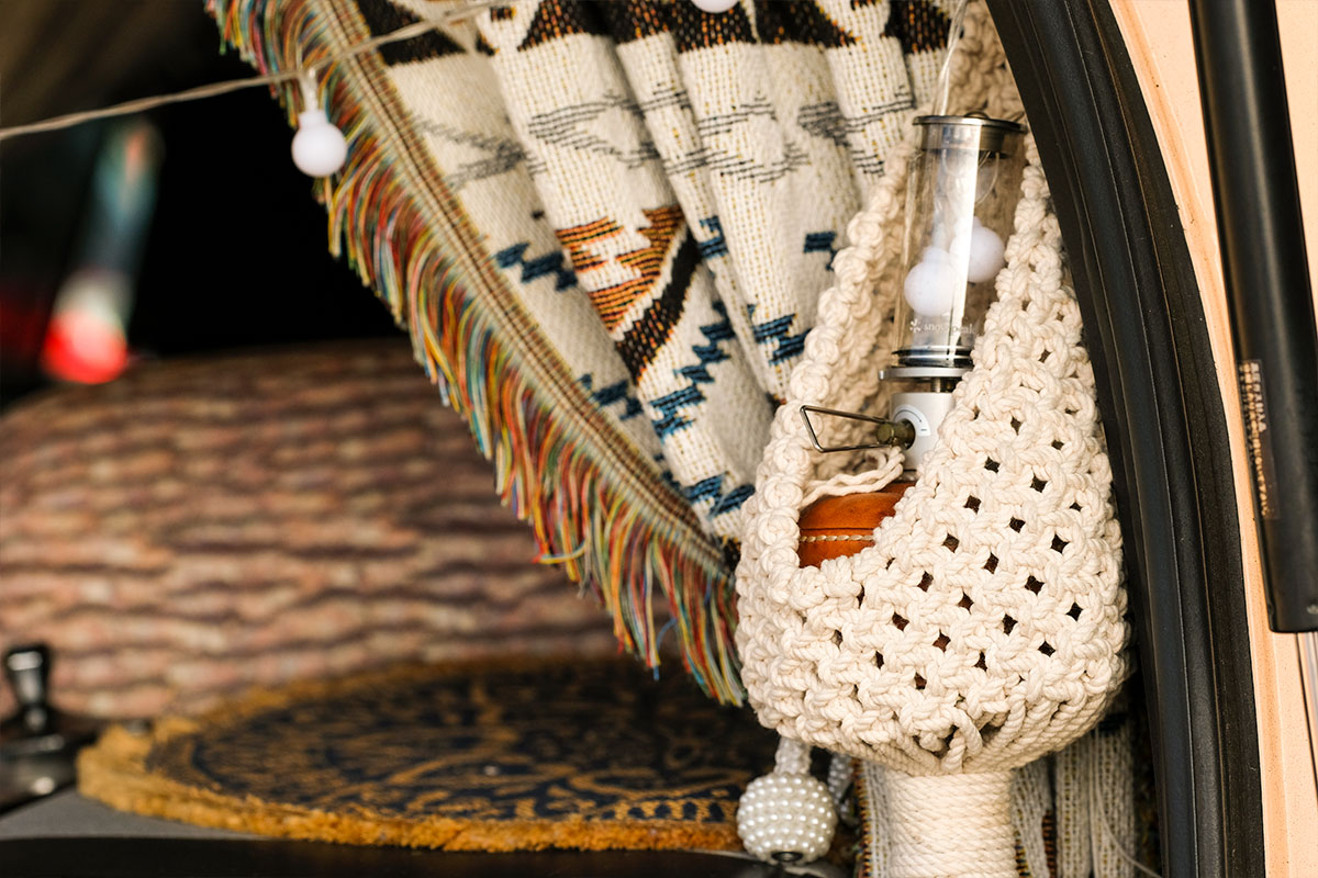 Bobo 喜歡自行動手製作車內配件,除了手織掛飾、吊籃,連盛載煮食爐的櫃台也是自行組裝。