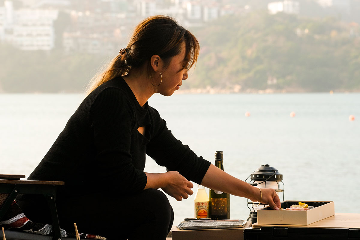 Bobo 泊好五人車,打開車尾門,密麻麻的堆滿各式用品,打開才見別有洞天,右邊的木架拉出來有煮食爐、水缸,左邊有張小木檯,內牆設有酒杯架,還掛有充滿波希米亞風的簾幕、枕頭套,不消 15 分鐘,小小車廂化身成溫馨的小天地,可以窩在內一整天。「玩一次車中泊,會大概看到那個人的喜好細節。在這個空間,你會知道我喜歡北歐簡約與波希米亞風,閒時愛摸酒杯底,特別是清酒,而且很愛吃。」她說過,車中泊是另類品味生活,當有人揶揄她窮得要瞓車廂,Bobo 則平反說車中泊是另一種層次的 staycation,其極致可以令你嘩然。像訪問這天,Bobo 約了朋友一起在聖士提反灣過 3 日 2 夜,帶來串燒(還備有多種醬汁)、和牛、清酒、零吃,放好環保碳燒至冒煙,放上肉串,於車上架設好投映機,隨即來一頓有海風伴隨的盛宴,格局絕對超乎想像。「我平時份人好心急,做什麼都要快快快,但車中泊時可以放空一整天,彷彿平衡返日常的急躁,焦慮得到釋放,人也比較快樂。」