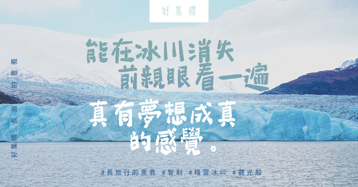 平常在看《animal planet》和國家地理節目時,心裡想著有機會一定要去看一次冰川。終於,我們存了錢,買了從香港經美國前往智利的機票,轉乘內陸機、再轉巴士和私家車方能進入的百內國家公園,在公園登上前往格雷冰川的船。我們經歷了好幾個日夜,看到了真正的「冰川藍」。然而,看到的同時,才深刻體會到,全球暖化問題是多麼真實又迫切。