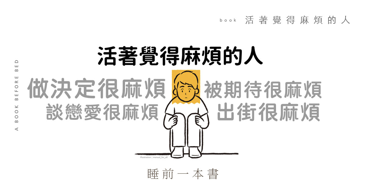 晨早起床,穿過人來人往的月台,下意識深吸呼幾下,不禁想:「活著,真是麻煩。」生活中大大小小的事都讓人感覺很煩厭,要見人好煩、要出街好煩、要諗食咩好煩⋯⋯ 既然咁煩,不如乾脆留在家裡,甚麼都不要做了——你也曾有這些想法嗎?