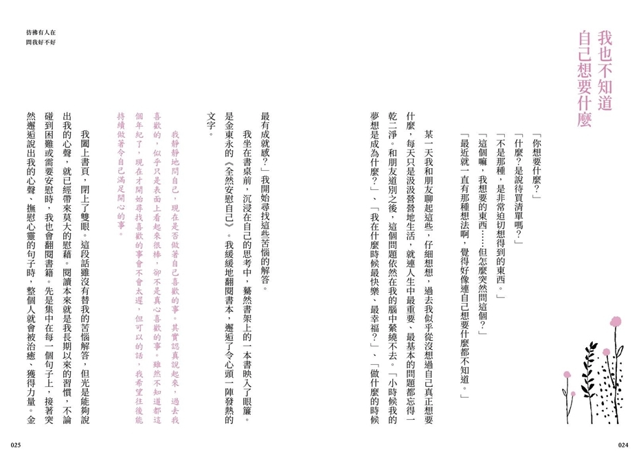 當情緒低落,內心渴望著溫暖與理解,卻發現無法與他人真正溝通,好像找不到合適的語言。或許是因為不知道自己真正想要的是什麼吧?這種迷惘和無助,像是一陣濃霧籠罩著內心。然而,就在那些令人心煩意亂的夜晚,我翻開了《我也不知道自己想要甚麼》。字裡行間,彷彿找到了心中渴望的陪伴。