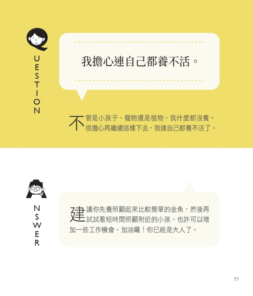 書的內容是來自日本「龜岡兒童新聞」的其中一個專欄,裡面全是大人向小孩尋求解決辦法的諮詢專欄。整本書都是滿滿的煩惱。沒想到,打開卻是滿滿的共鳴。