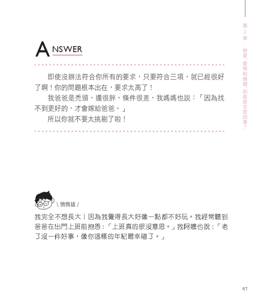 如果有人問我這些問題,我還得花上半天思前想後,然後自己也陷入沉思。但在書裡,小記者就以最直接的感受回應,道破了一些不願面對的答案,說穿平日想掩飾的假象,也重新提醒人生的意義。