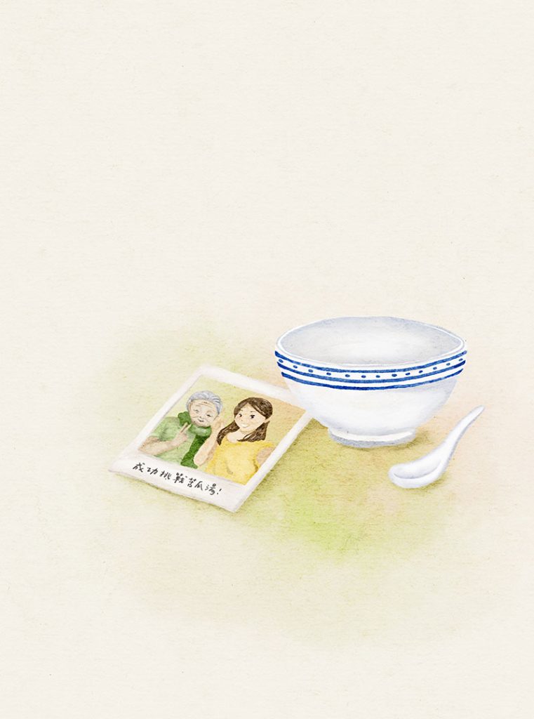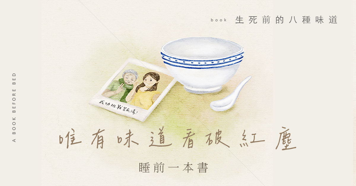 繪本《生死前的八種味道》由香港華人基督教聯會廣蔭頤養院出版,訪問了八個婆婆,訴說她們的人生遭遇和辛酸,甚至與家人面對衝突、隔閡、分離,走到人生最後一程,回想起,哪一道菜,令人再三回味?在中國人傳統文化中,飯桌是人生舞台,有拗撬,有歡笑;老媽子從不說「我愛你」,但囉囉嗦嗦說「記得返嚟飲湯」,比「我愛你」更真摯動人;說完「生嚿叉燒好過生你」,然後,加餸斬料一起食叉燒;一菜泯恩仇。一家人的感情,百般滋味在心頭。