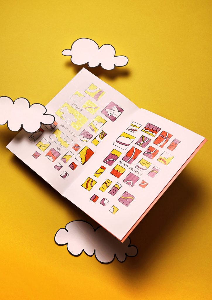 翻閱 《The Land of Uncertainty》時,會發現每頁的文字非常的少,取而代之是特殊的印刷方式,讓圖中的邊框和色塊有著專屬的觸感,比如黃色是波紋、紫色是斜線、黑色是條狀,邊掀書邊感受不同部分帶來的觸感。