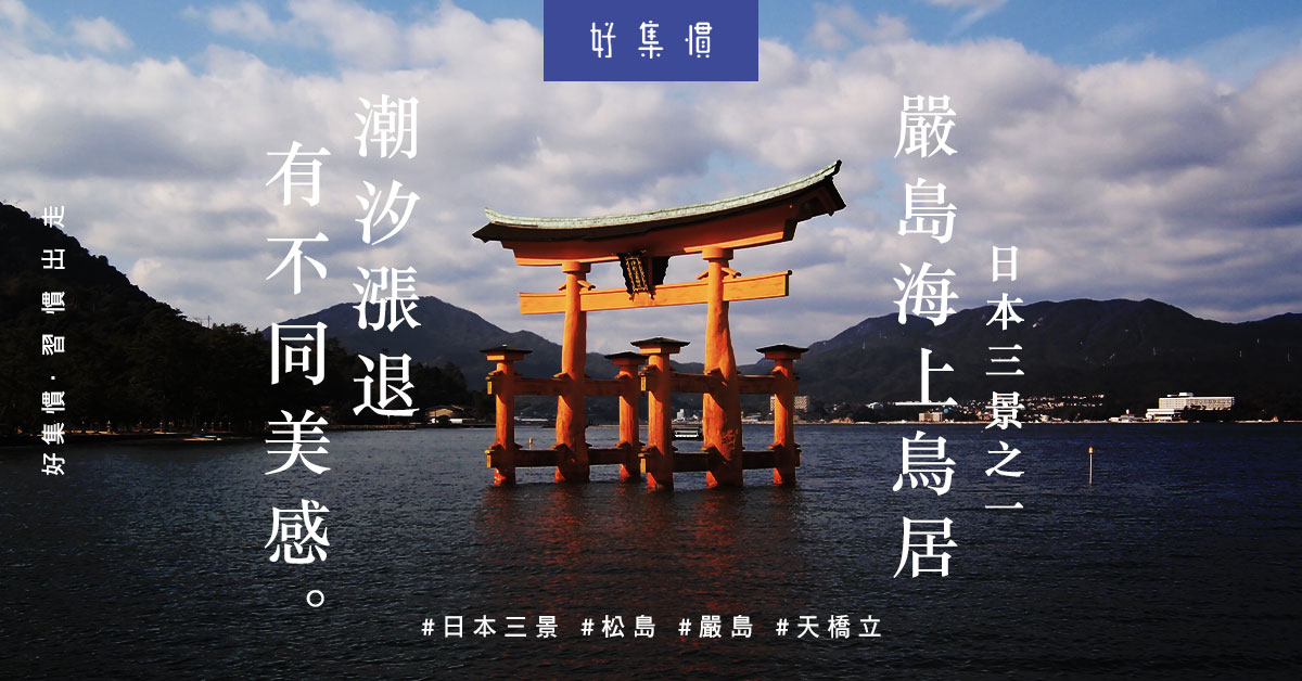 全島在1934年被劃入瀨戶內海國立公園,更被列為日本文化遺產、特別史跡和特別名勝及世界遺產。嚴島神社內藏有不少國寶級建築及工藝品,但主角始終是直立在瀨戶內海中的朱紅色大鳥居。海水潮漲時,鳥居就如漂浮在水面上,明信片般的絕景活現眼前。潮退又有另一種感覺,親身走到鳥居下,近距離感觀賞建築細節。