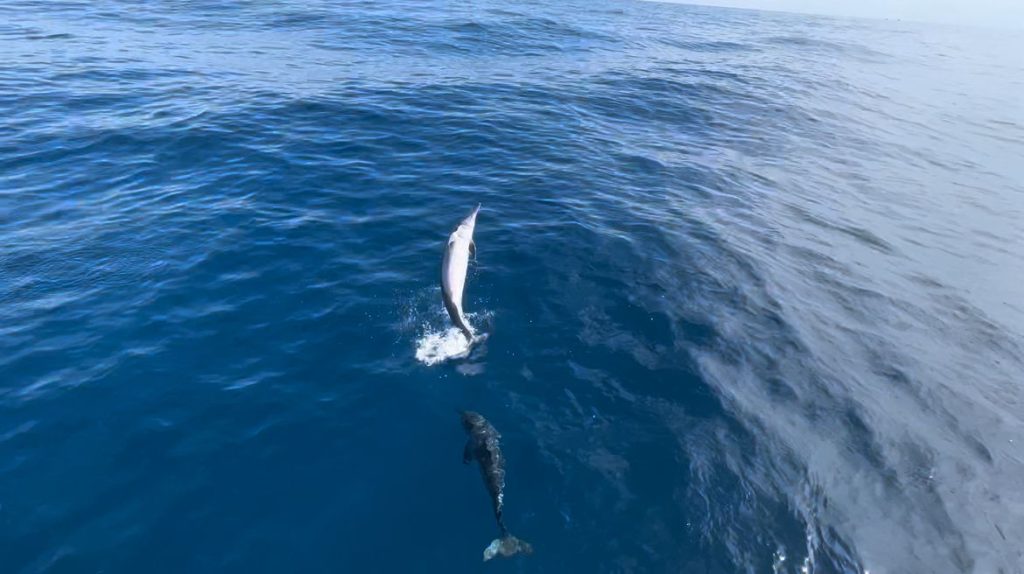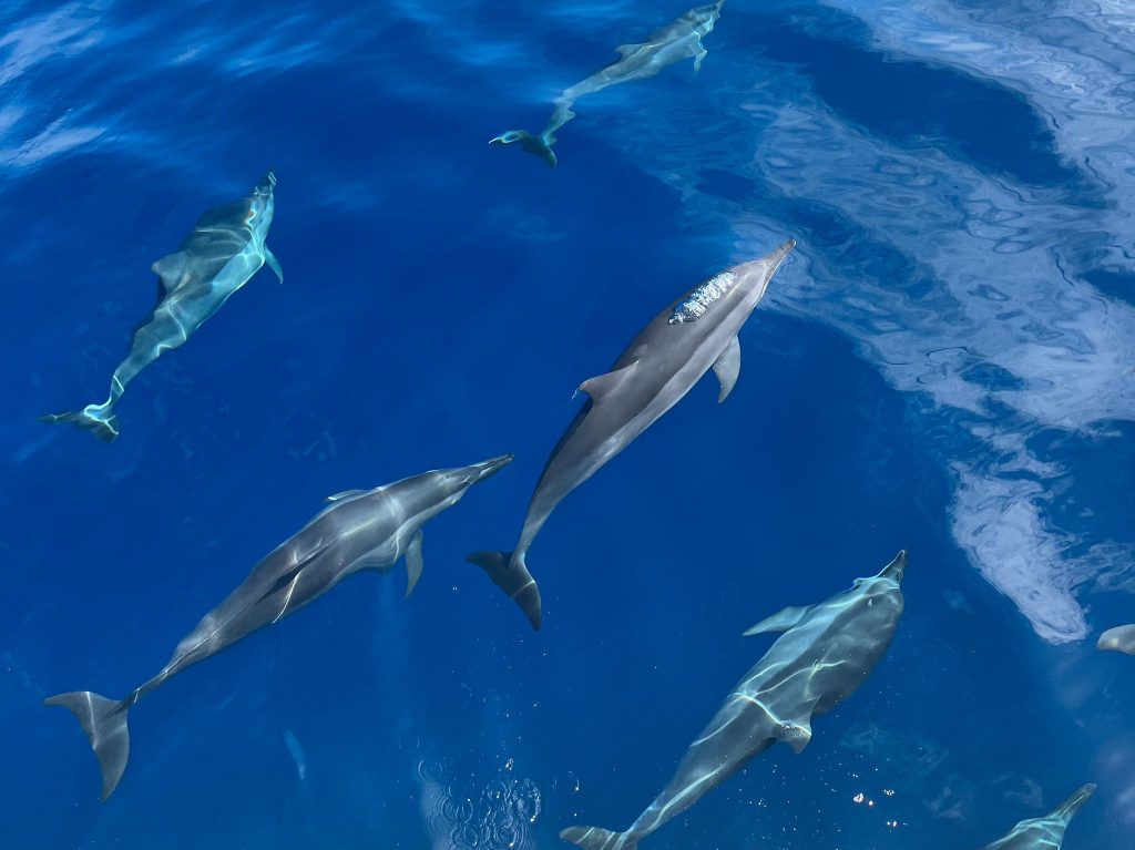 船慢慢在海上駕駛,陽光把海面曬得金光閃閃,我們或戴上墨鏡、或瞇起雙眼,認真細看海面。隨著時間過去,還未見海豚身影,大家都從最初的興奮期待,到開始心裡默默祈求海豚們的出現。突然間導遊再次開咪說,「付出的努力是有回報的。」還未意識到什麼事時,只見遠方已經有幾艘船圍成一個大圓圈,海面上忽然有些波湧 —— 原來是過百條海豚就在那裡暢泳!由於太遠,我們還是不敢相信雙眼,直到一大堆海豚就在我們眼前跟著船一起游動,才終於有真實的感覺。