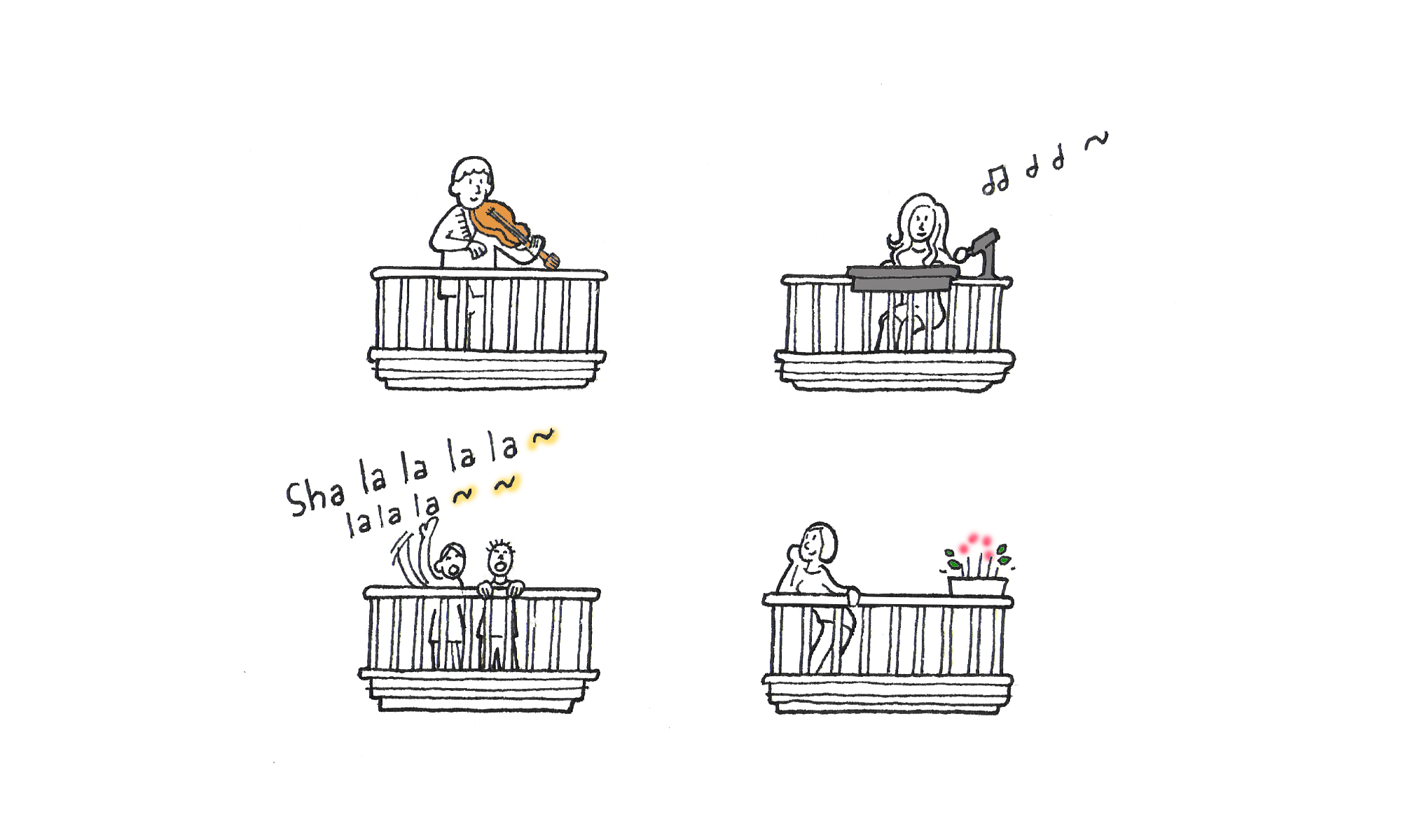 而村民與村民之間,沒有因為分隔而變得疏離,就好像在陽台來個即慶音樂合奏,以不一樣的方式凝聚社群,互相勉勵。