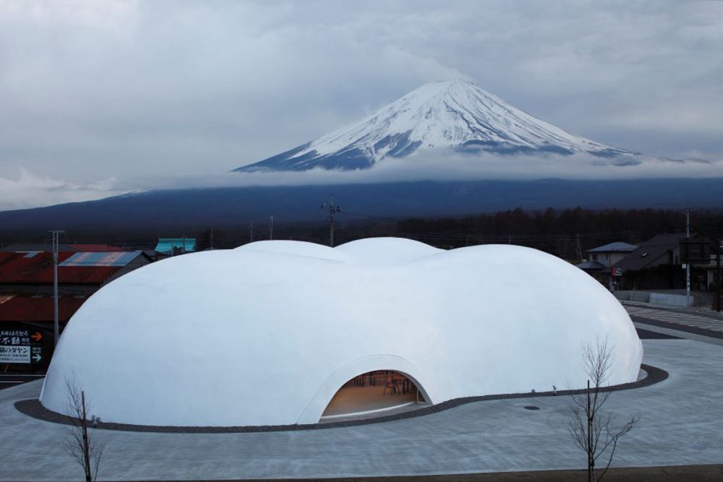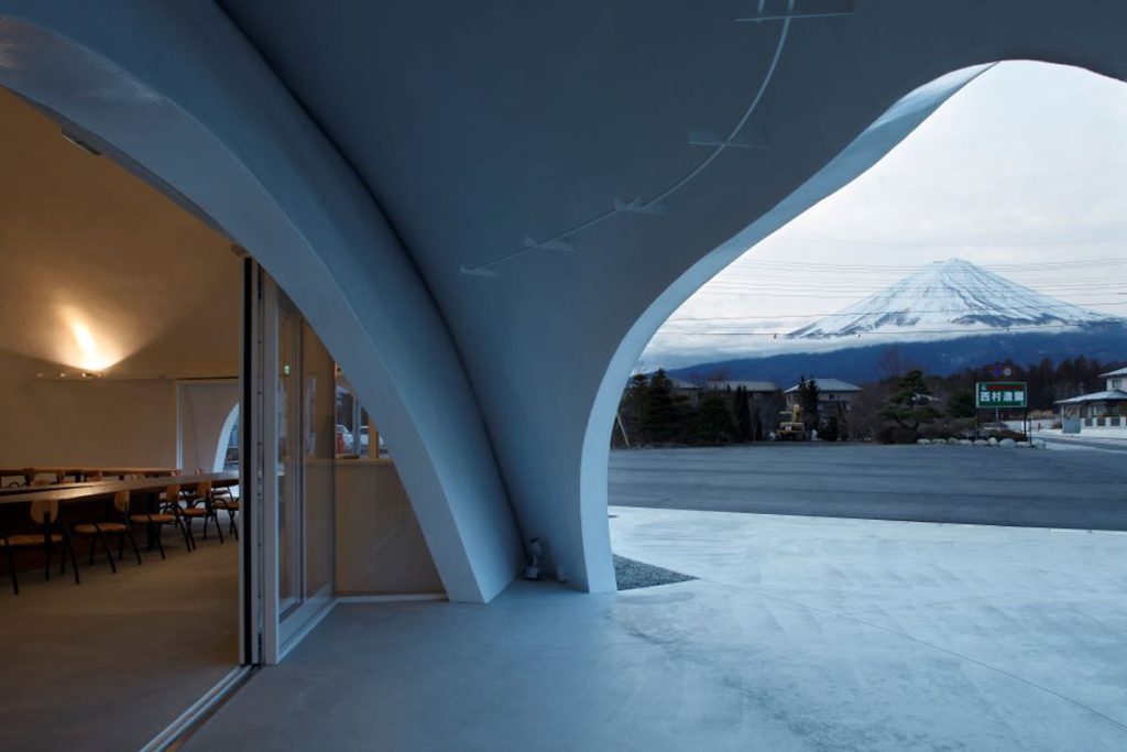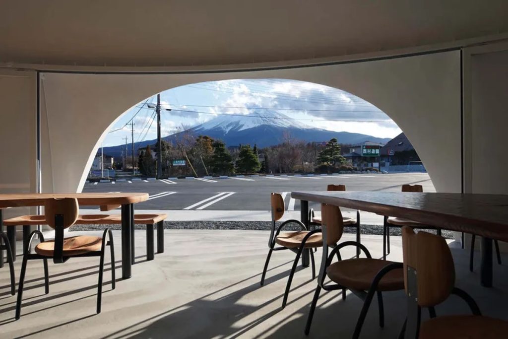 「東戀路店」是品牌旗下第 4 間分店,操刀設計師保坂猛同屬山梨縣人,因此他希望透過新穎活潑的建築風格,吸引更多年輕人到來品嚐家鄉美食,也認識當地獨有的餐飲文化和歷史。保坂猛注重建築和自然地景的融合,今次就參考富士山頂的白頭積雪及繚繞雲朵為概念,在山腳下創建了這座宛如純白雲朵的「東戀路店」,將餐廳與富士山美景互相襯托,構成一幅柔和又療癒、無縫銜接的風景。