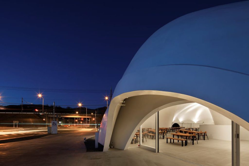 店舖是「無樑柱、無空調」的純白洞穴建築,由一片大型曲面殼體構成。保坂猛建築團隊精心計算結構型態,交叉分析反向懸吊原理、溫熱環境、光線分佈、雨水流動、通風等參數,先將全個曲面殼體分岔成兩片、再匯聚回單片,並採用「三明治」結構製成,即是於鋼筋混凝土、玻璃纖維強化水泥兩種材質中間,注入硬質的 PU物料,藉此提升整體強度及隔熱效果,營造具備耐久性的建築硬體。