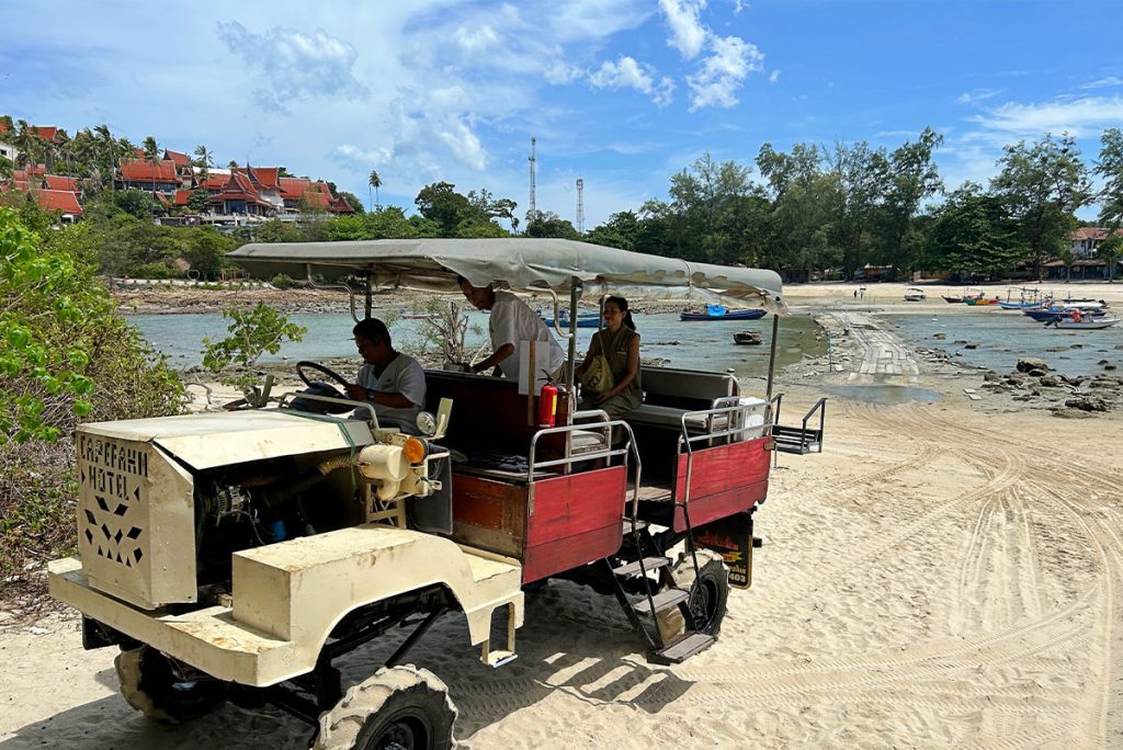 酒店位於蘇梅東北部較寧靜的曾蒙海灘(Choengmon Beach),附近一個名為Koh Fahn小島之上,坐擁自成一國的私密感。登島要趁退潮時,坐上一部越野接駁車,緩慢地橫過淺水的木橋棧道,還有兩隻可愛小狗如侍衛般伴隨,充滿儀式感。 潮漲時小島四面環海,回到主島更要坐船才能前往。
