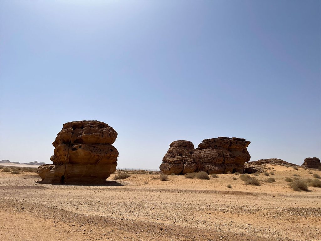 車子越駛越深入沙漠中央,遠離了市區,極目遠望,盡是黃土。沙漠上一粒粒巨型奇石就像從天跌下、隨意散落在沙漠不同的位置,全部都有數層樓高,就像走進了異星球,很難想象昔日竟然有人聚居於此地。